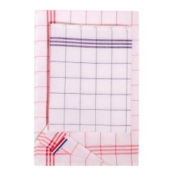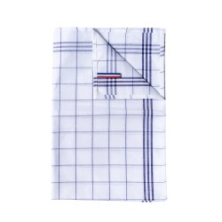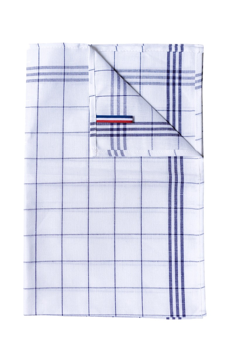 50% lin / 50% coton. 3 rayures de chaque côté. Étiquette tricolore reprenant le drapeau français servant de lien d'accrochage. Étiquette autocollante détachable : "Origine France garantie - Produit en Bretagne". Recommandation pour un essuyage parfait : laissez tremper 12 h dans l'eau froide, puis lavez 2 à 3 fois à température recommandée.