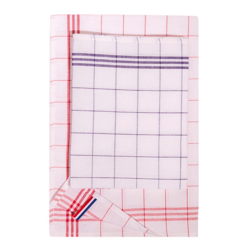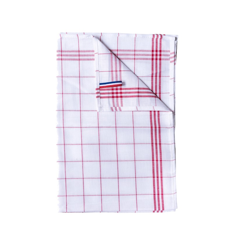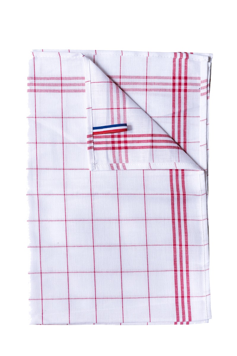 50% lin / 50% coton. 3 rayures de chaque côté. Étiquette tricolore reprenant le drapeau français servant de lien d'accrochage. Étiquette autocollante détachable : "Origine France garantie - Produit en Bretagne". Recommandation pour un essuyage parfait : laissez tremper 12 h dans l'eau froide, puis lavez 2 à 3 fois à température recommandée.