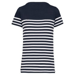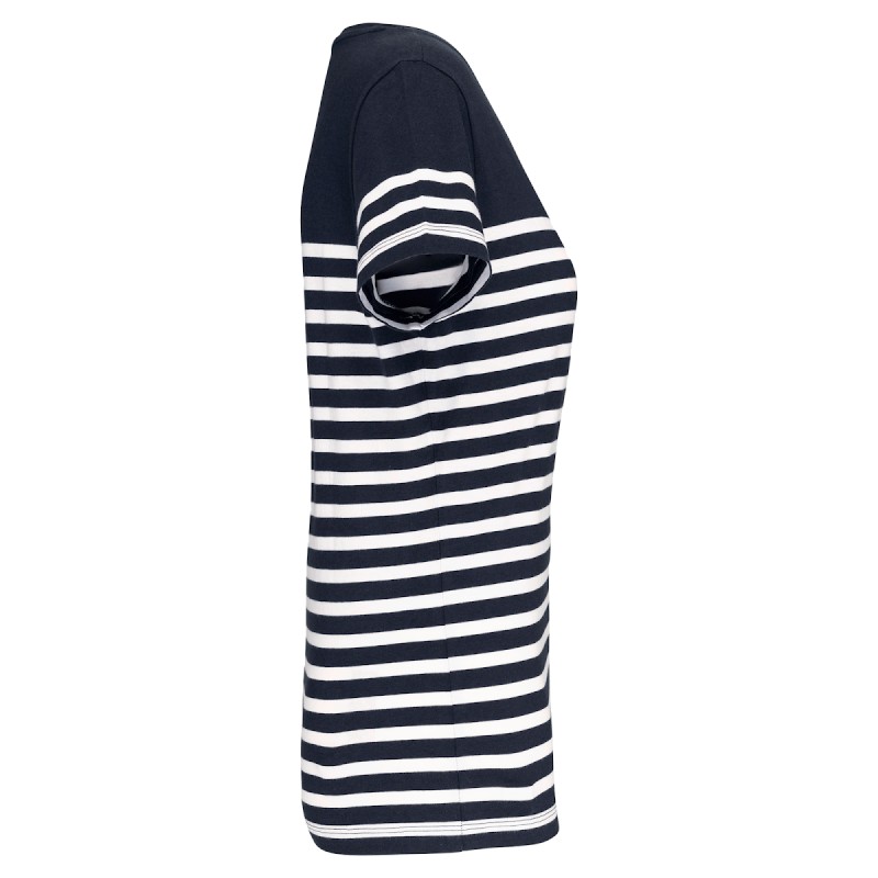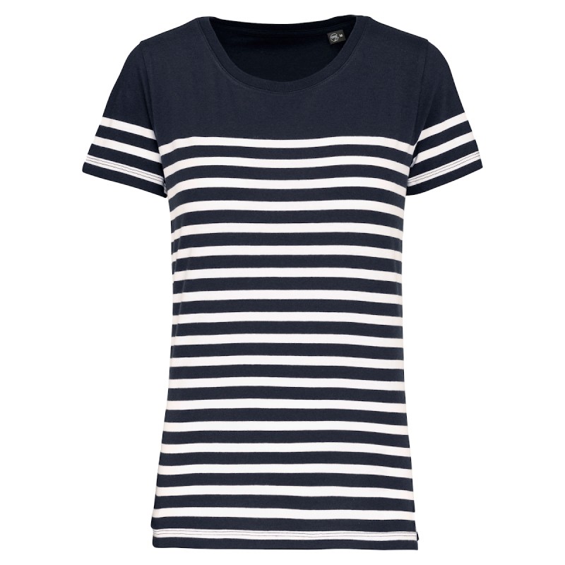 100% coton biologique. Coupe droite. Lavage aux enzymes. Encolure ronde avec bord-côte 1x1. Rayures tricotées. Bande de propreté au col. Finition double aiguille bas de manches et bas de vêtement. Pas d'étiquette de marque pour faciliter la personnalisation.