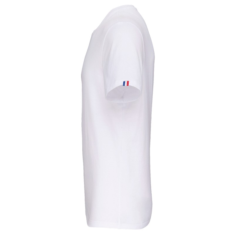 100% coton peigné biologique. Label "Origine France Garantie". Coupé / cousu. Encolure ronde en bord-côte. Bande de propreté ton sur ton dans l’encolure (prolongement dos-épaule). Vignette clip Bleu / Blanc / Rouge sur le bas de manche gauche au porter. Finition double aiguille bas de manches et bas de vêtement. Emballage 100% recyclable.
