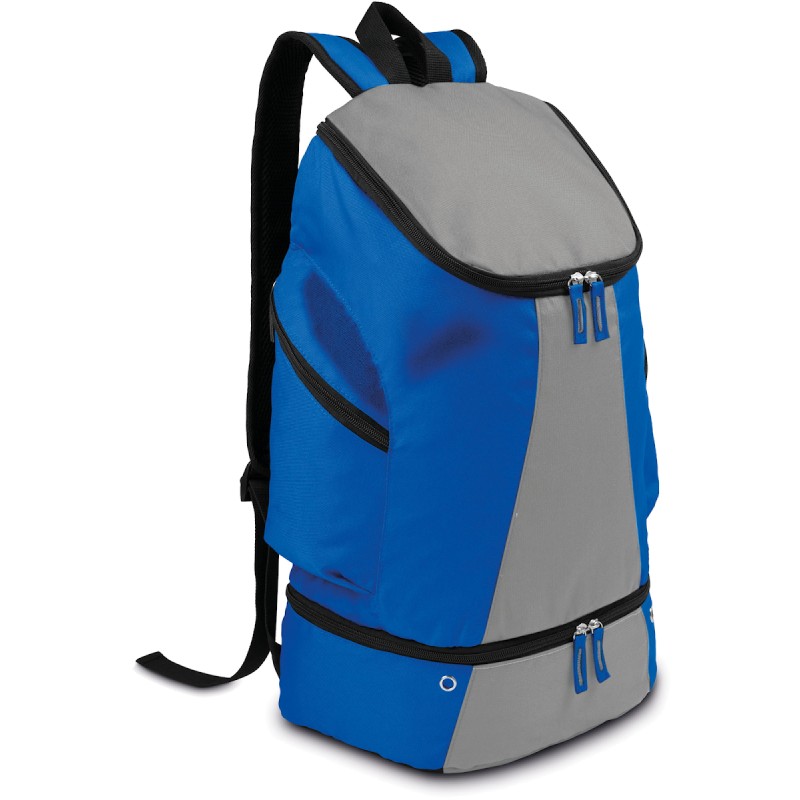 Sac à dos sport en polyester 600D + Ripstop 300D. Grand compartiment central, compartiment pour chaussures avec oeillets. Poches latérales, dos matelassé respirant et bretelles ajustables.