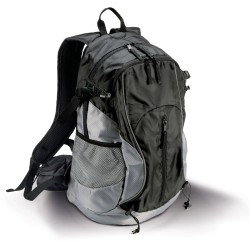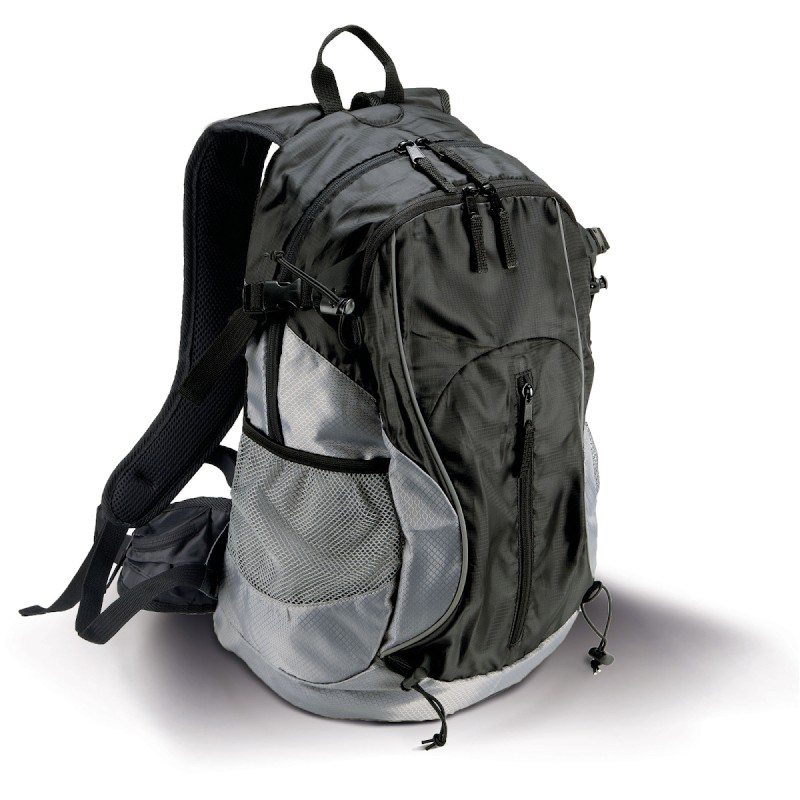 Sac à dos multisports/randonnée en ripstop et polyester alvéolé. 2 compartiments intérieurs, poche zippée devant, poches côtés en filet, équipé d'un élastique porte-bâton, bretelles et ceinture ergonomiques, orifice prévu pour poche à eau.