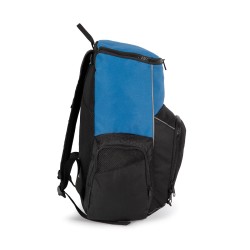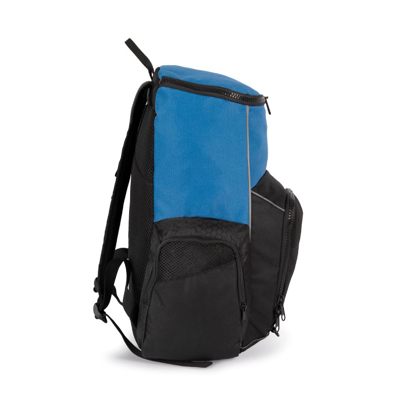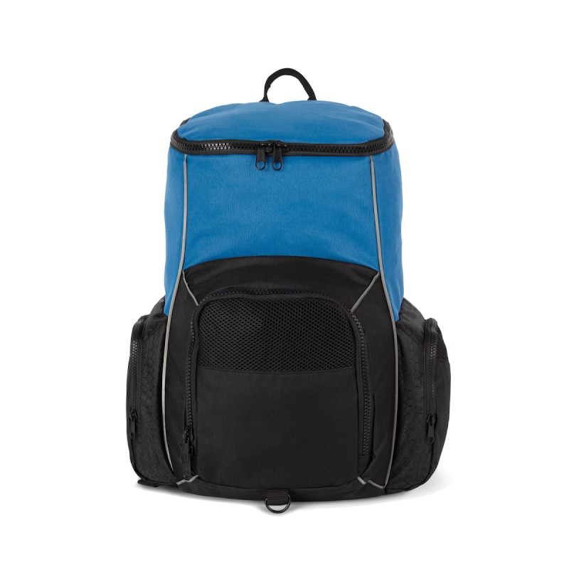 100% polyester. Sac à dos de sport conçu à partir de 50% de polyester recyclé post-consumer. Grande poche avant imperméable pour chaussures et objets, idéale pour les sports nautiques pour ranger le matériel mouillé. Détail en mesh sur la poche avant et les poches latérales pour garantir une aération optimale.