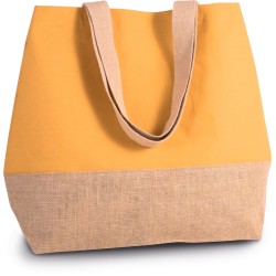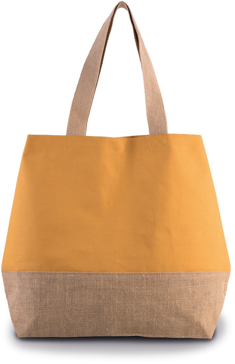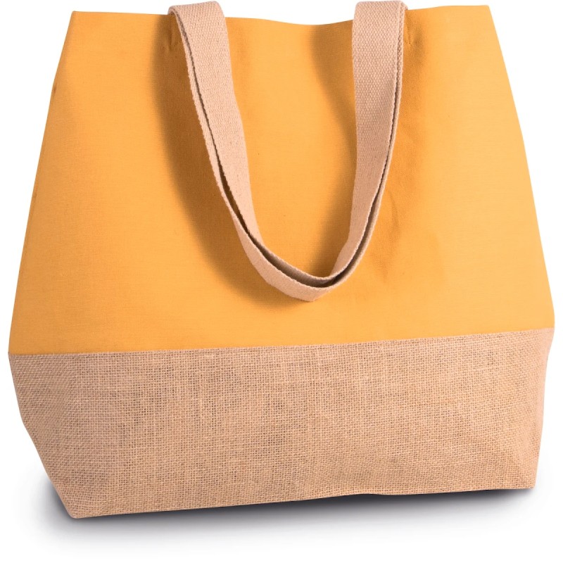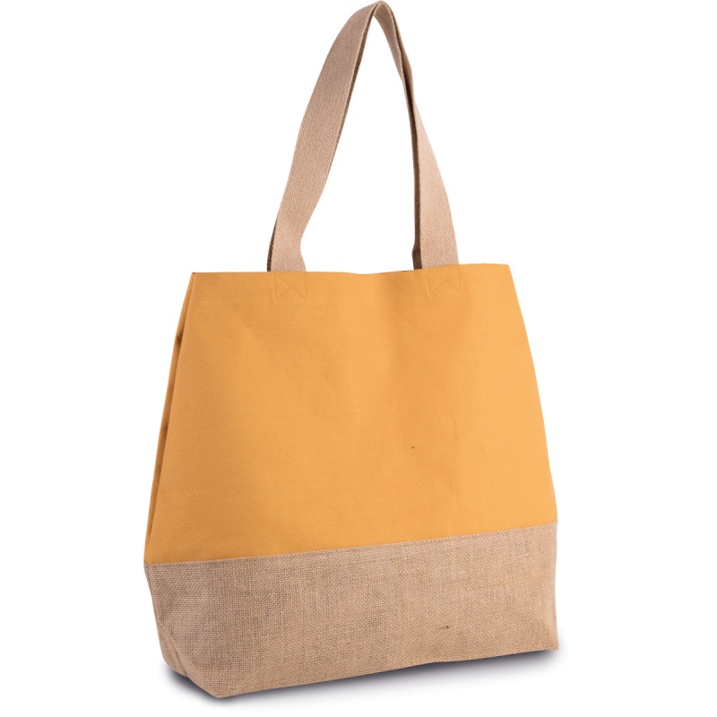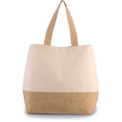 Grand sac fourre-tout en coton avec fond laminé en toile de jute naturel. Poche intérieure zippée. Soufflet. Poignées de 55 cm en coton. Fermeture à boutons pression.