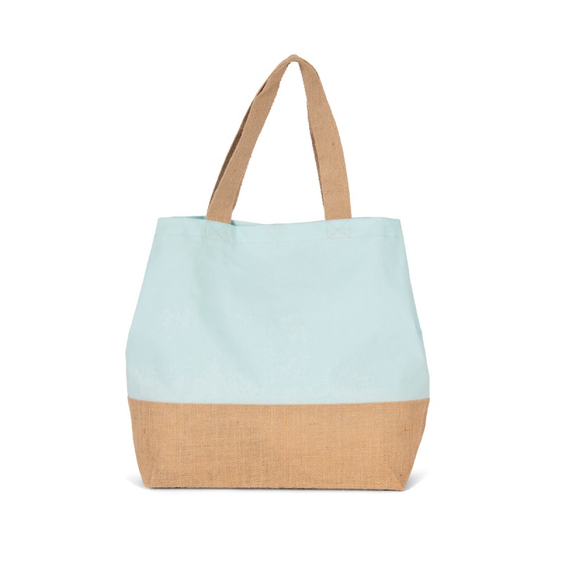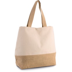 Grand sac fourre-tout en coton avec fond laminé en toile de jute naturel. Poche intérieure zippée. Soufflet. Poignées de 55 cm en coton. Fermeture à boutons pression.