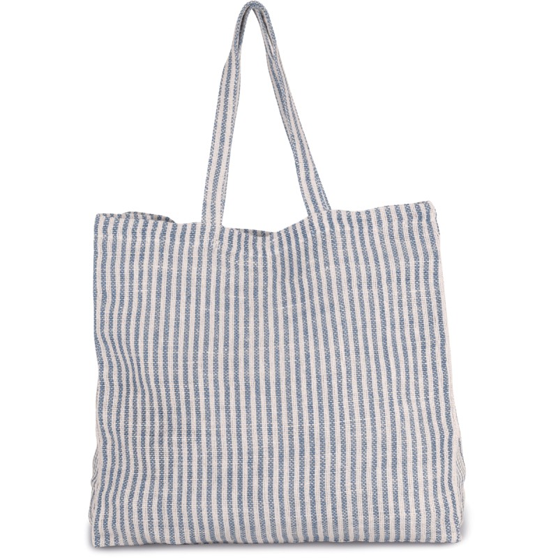 Sac shopping en jute et coton (juco) de forme carrée avec rayures en tissé-teint. Poche intérieure zippée. Poignées de 55 cm dans le même tissu.
