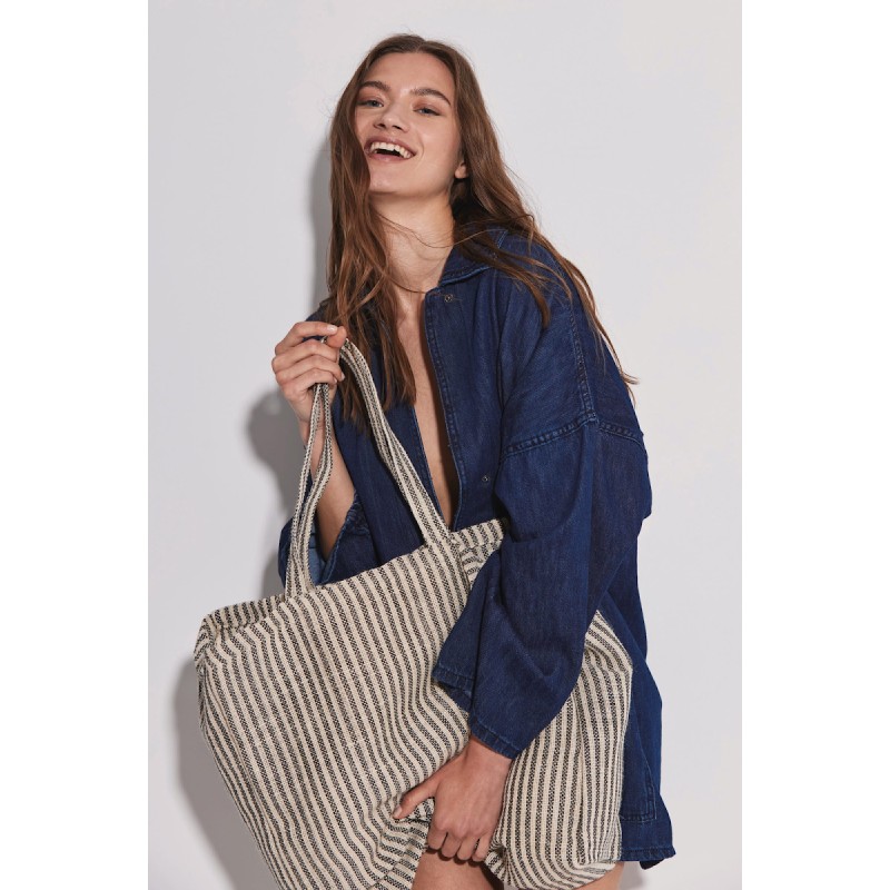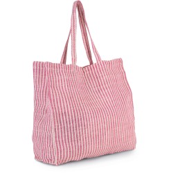 Sac shopping en jute et coton (juco) de forme carrée avec rayures en tissé-teint. Poche intérieure zippée. Poignées de 55 cm dans le même tissu.