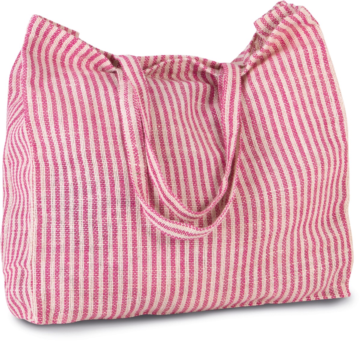 Sac shopping en jute et coton (juco) de forme carrée avec rayures en tissé-teint. Poche intérieure zippée. Poignées de 55 cm dans le même tissu.