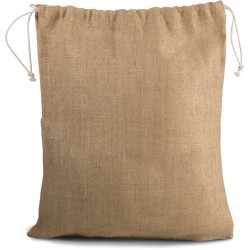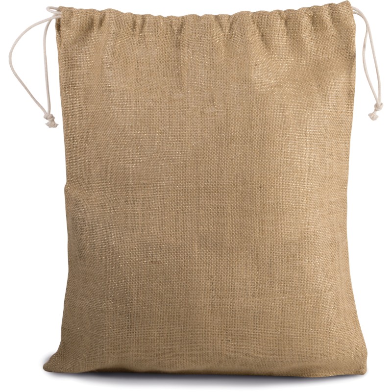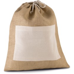 Sac en toile de jute avec cordelettes, entretissé de fils brillants de couleur contrastée. Poche avant en coton pour faciliter la personnalisation.