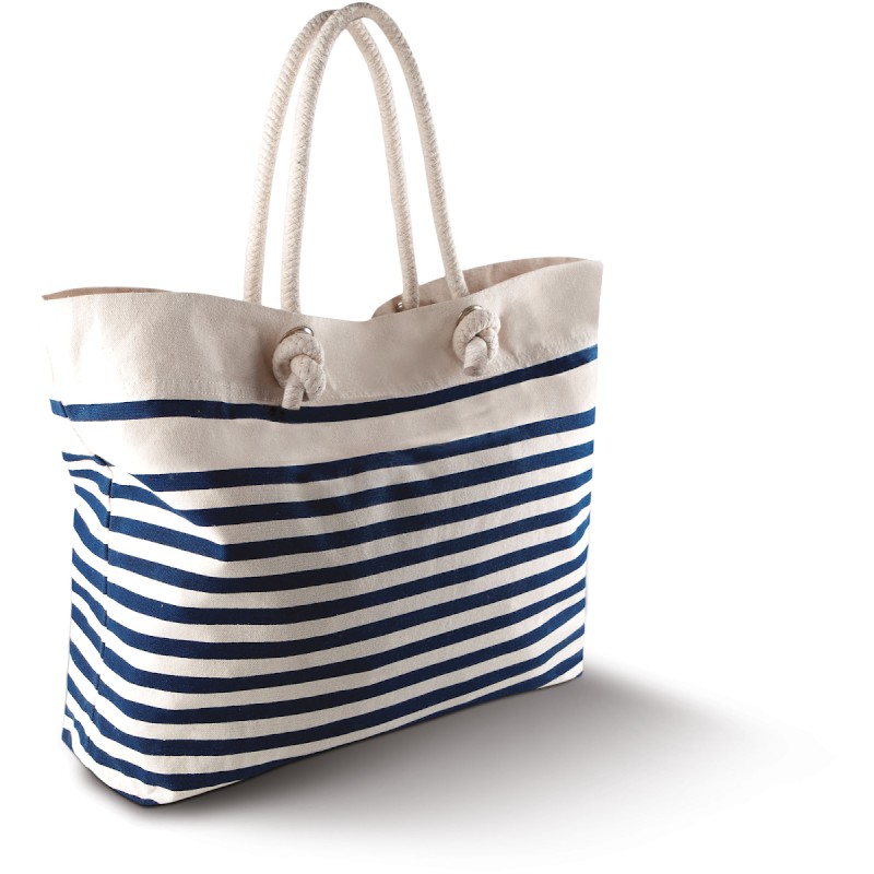 Grand sac de plage style marin en coton canvas. Anses en cordelettes de coton, poche intérieure zippée, fermeture avec bouton pression.