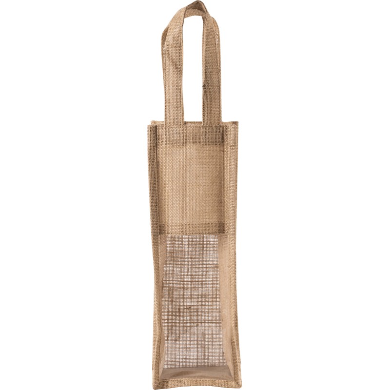 Sac porte-bouteille en toile de jute, avec 2 poignées et fenêtre transparente sur le devant. Conçu pour 1 bouteille.