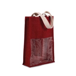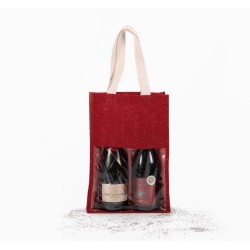 Sac porte-bouteilles en toile de jute, avec 2 poignées et fenêtre transparente sur le devant. Conçu pour 2 bouteilles.
