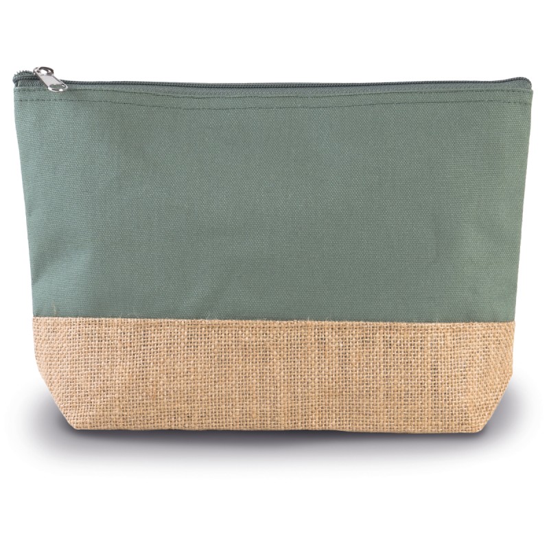 Pochette en toile de coton avec base contrastée en jute naturelle laminée.