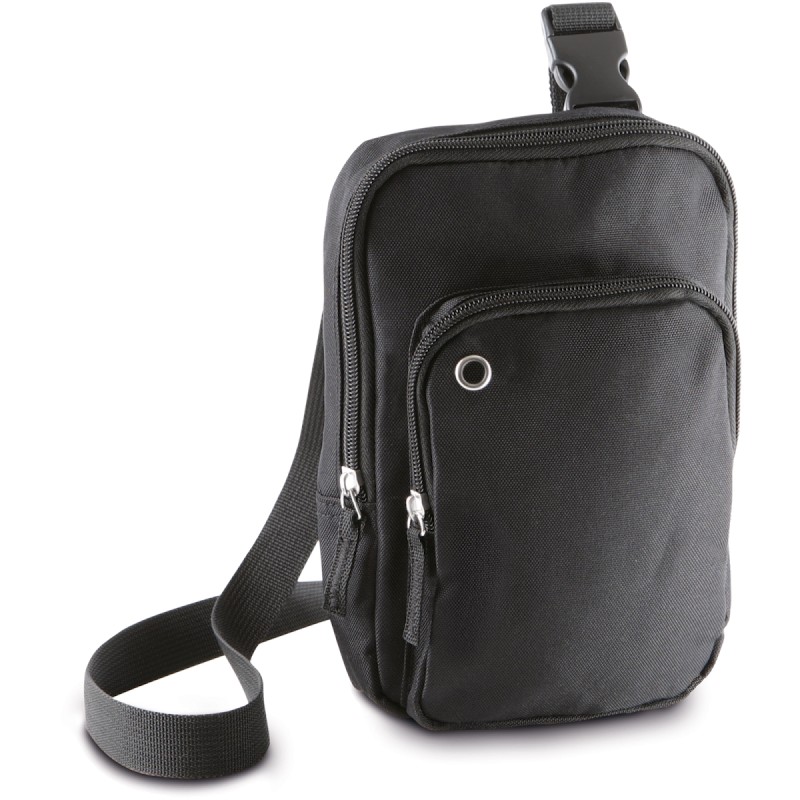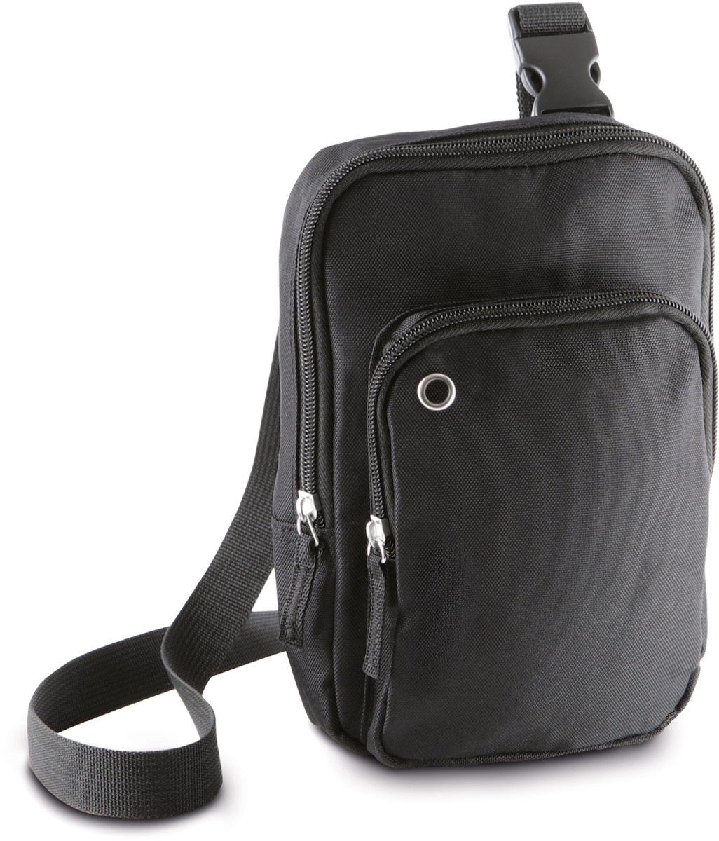 Sac bandoulière en polyester 600D. Bandoulière ajustable, compartiment central avec porte-clefs et poche frontale zippée + poche au dos.