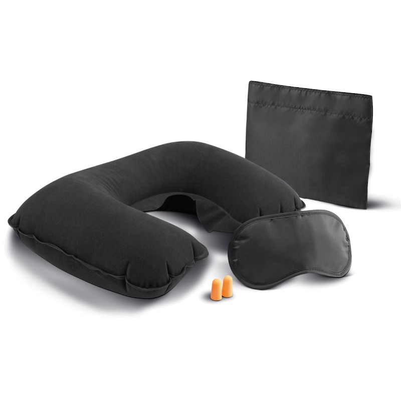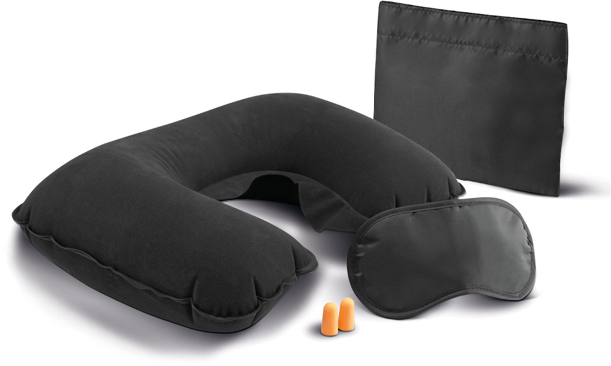 Set de voyage en polyester 210D, fourni avec housse personnalisable. Fermeture avec scratch central. Avec bouchons d'oreilles, masque pour les yeux, protège-nuque gonflable.