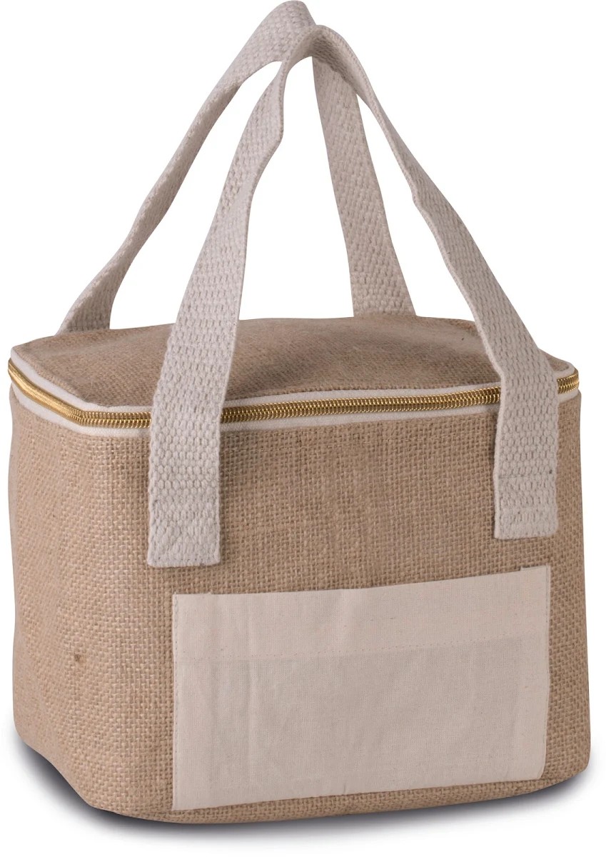Sac isotherme avec extérieur en toile de jute et poche en coton pour faciliter la personnalisation, intérieur isotherme avec paroi isolante en aluminium et mousse isotherme haute densité. Poignées en coton. Petit modèle.