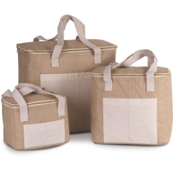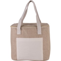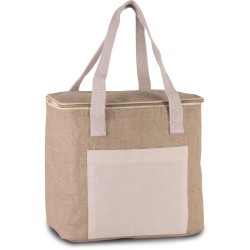 Sac isotherme avec extérieur en toile de jute et poche en coton pour faciliter la personnalisation, intérieur isotherme avec paroi isolante en aluminium et mousse isotherme haute densité. Poignées en coton. Modèle moyen.