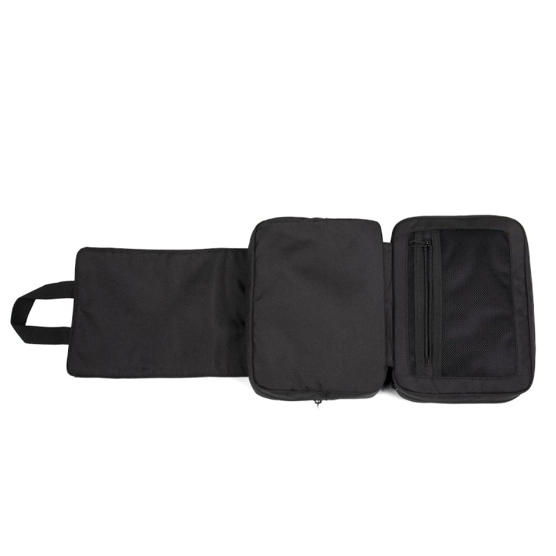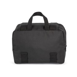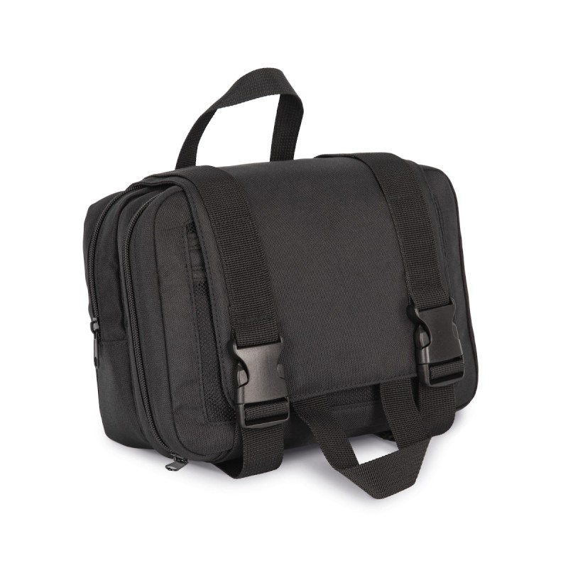 100% polyester. Trousse de toilette conçue à partir de 50% de polyester recyclé. Double compartiment avec fermetures éclair. Rabat de fermeture avec double boucle offrant une belle surface de personnalisation. 2 poignées qui permettent de l’accrocher verticalement.