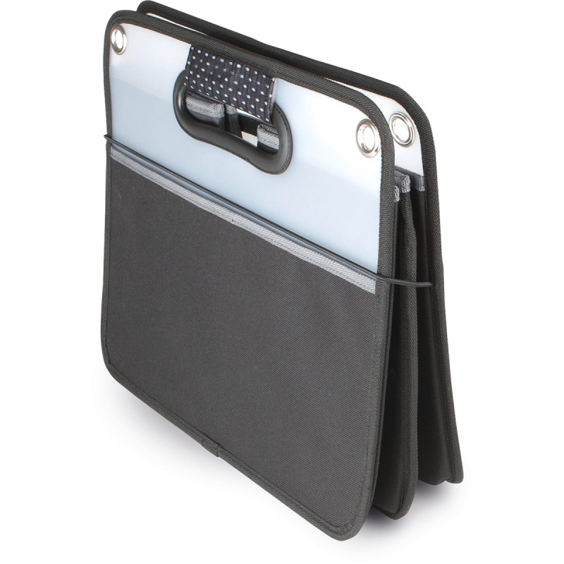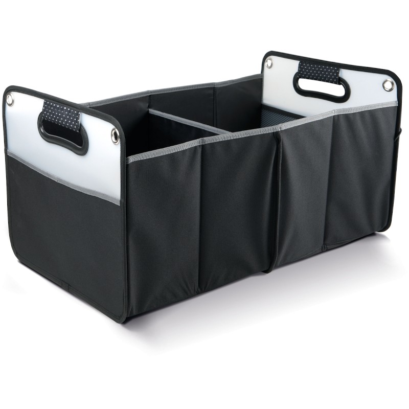 Sac rangement pour coffre en polyester 600D, 2 grands compartiments pliants avec fermeture élastique, poche côté, œillets métalliques sur côtés.