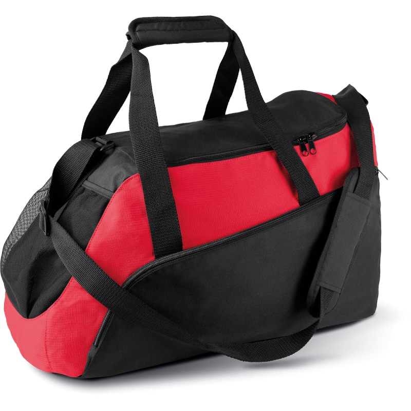 Sac de sport en polyester 600D et ripstop, 2 poignées, bandoulière ajustable, poche extérieure en filet sur le devant, grandes poches côté.