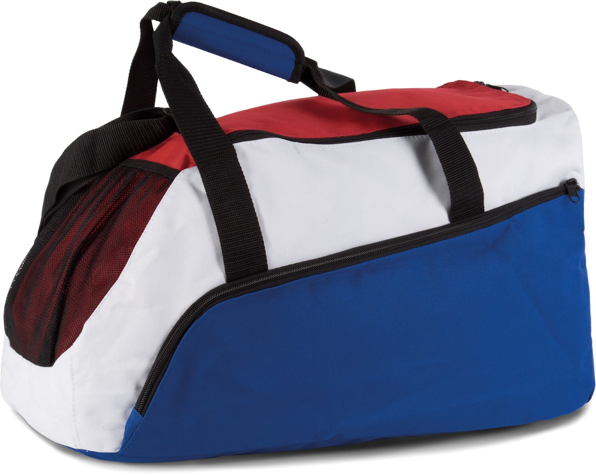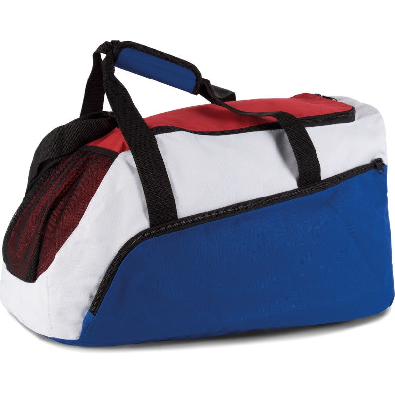 Sac de sport en polyester 600D et ripstop, 2 poignées, bandoulière ajustable, poche extérieure en filet sur le devant, grandes poches côté.