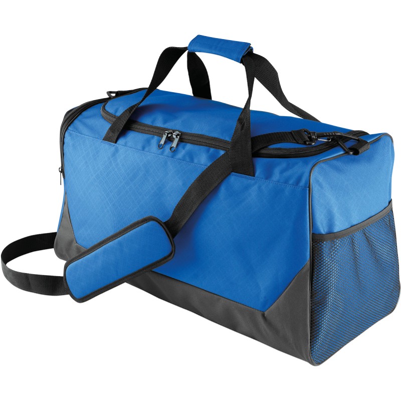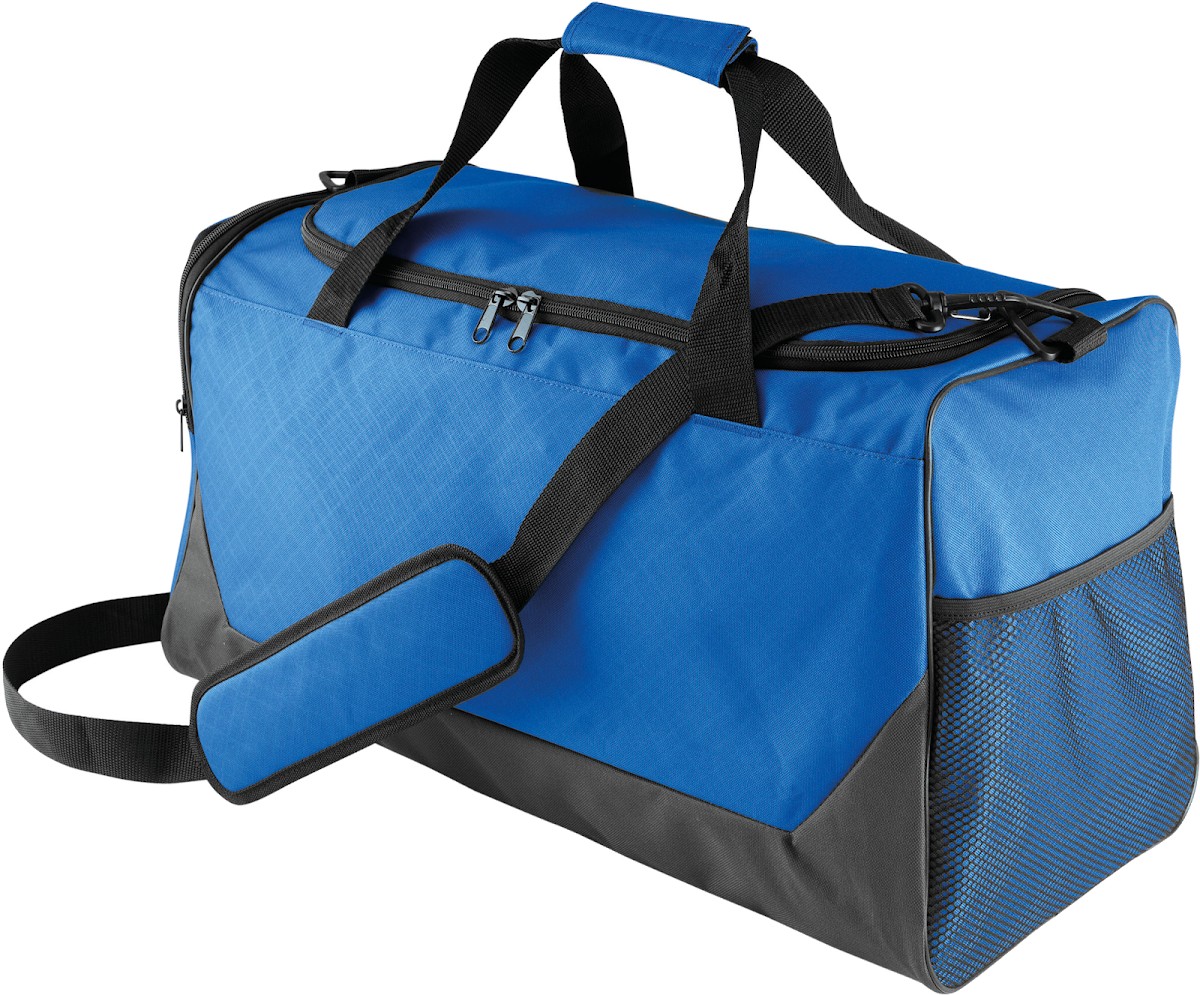 Sac de sport en polyester 600D. 2 poches côté, une en filet, une pour rangement chaussures, lanière d'épaule amovible.