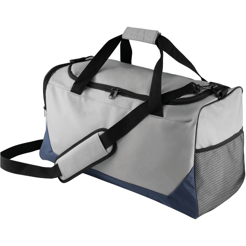 Sac de sport en polyester 600D. 2 poches côté, une en filet, une pour rangement chaussures, lanière d'épaule amovible.