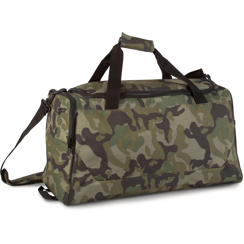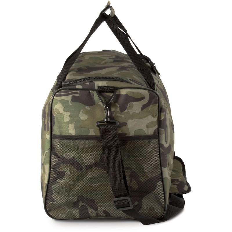 Sac de sport en polyester 600D. 2 poches côté, une en filet, une pour rangement chaussures, lanière d'épaule amovible.