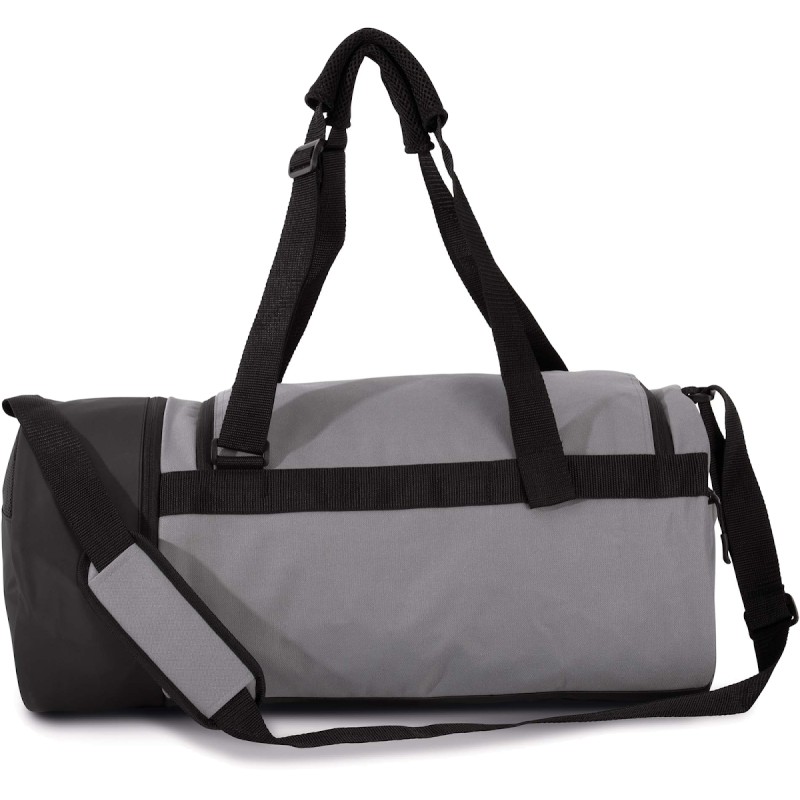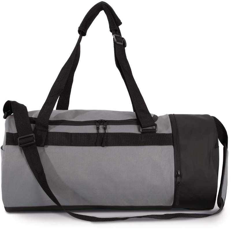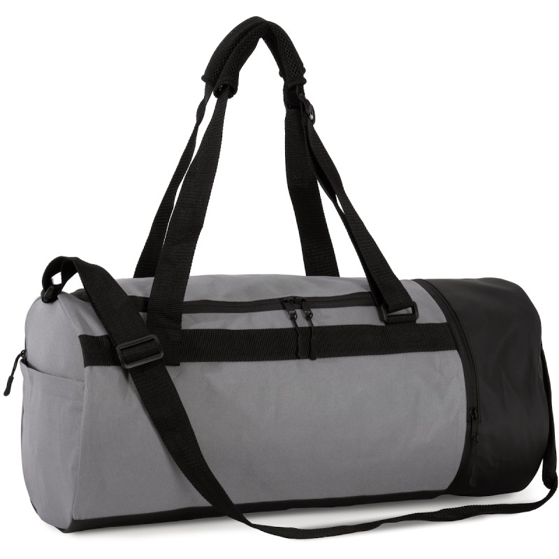 100% polyester. Sac de sport forme tube en polyester 600D. Doté d'un compartiment range-chaussures séparé avec une fermeture zippée et d'une bandoulière amovible. Possibilité de l'utiliser en mode sac à dos grâce à ces deux larges anses qui peuvent servir de bretelles.