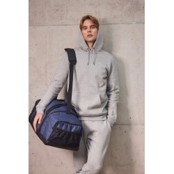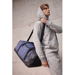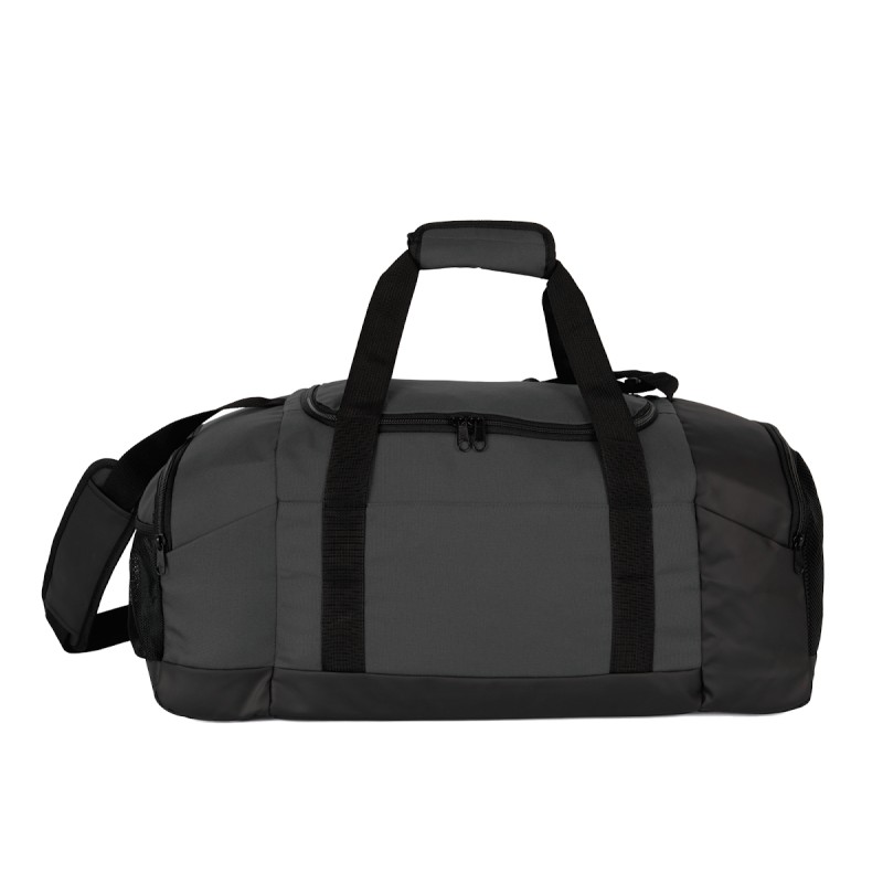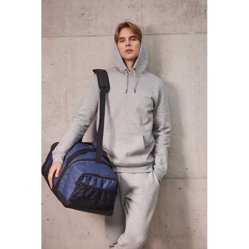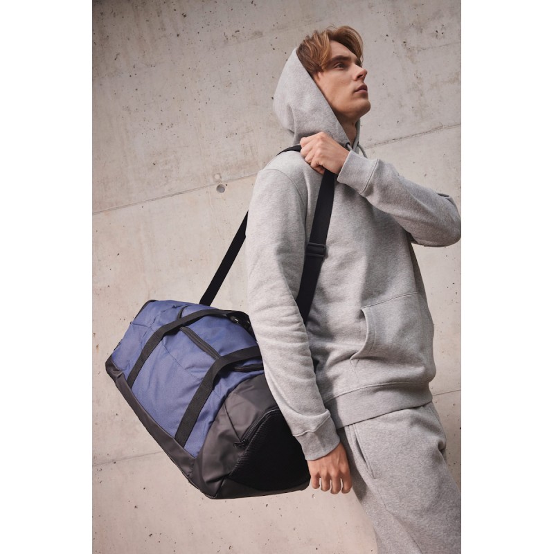 100% polyester. Sac de sport avec double compartiment latéral conçu à partir de 50% de polyester recyclé. Panneau en filet dans l'un des 2 compartiments latéraux, idéal pour ranger des vêtements humides, avec poche filet dans l'autre compartiment. Tapis repose-pied inclus pour se changer sans toucher le sol avec ses pieds.