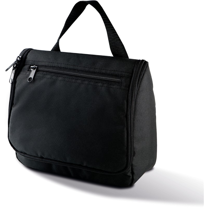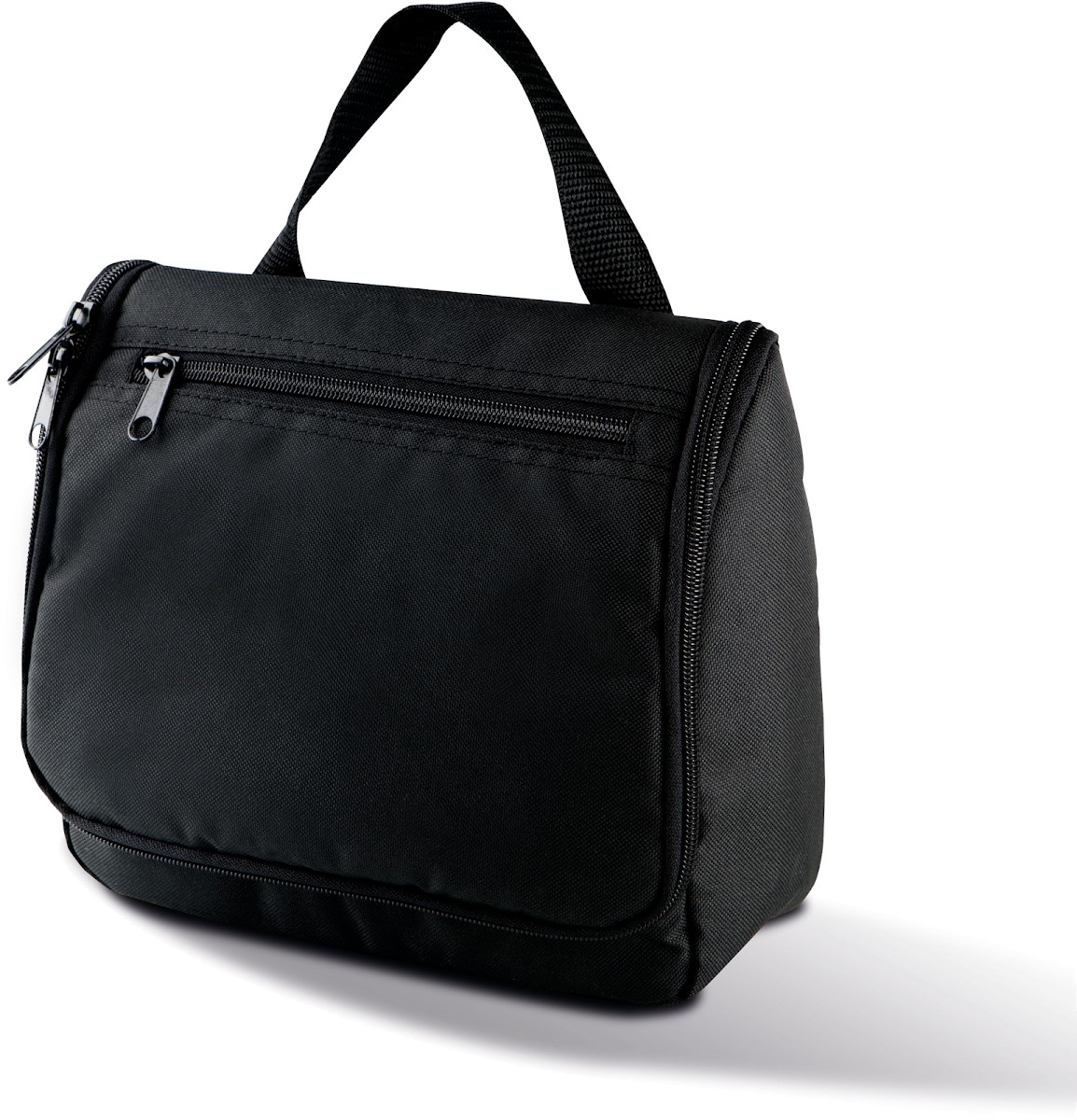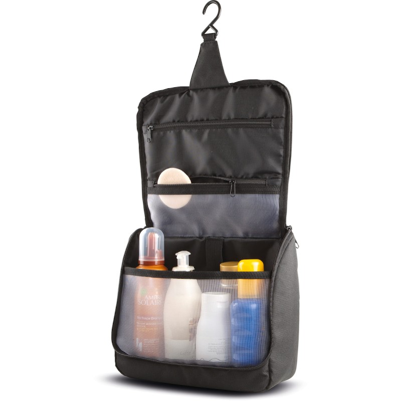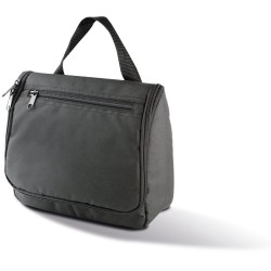 Trousse de toilette en polyester 600D, composée de polyester recyclé. Ouverture zippée sur rabat devant, compartiments intérieurs en filet, crochet de suspension.