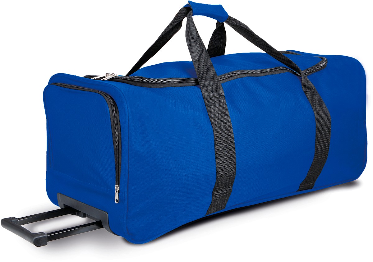 Sac de sport/ trolley en polyester 600D, grande ouverture sur le dessus, compartiment range-chaussures sur le côté, lanières renforcées tout autour du sac.