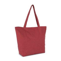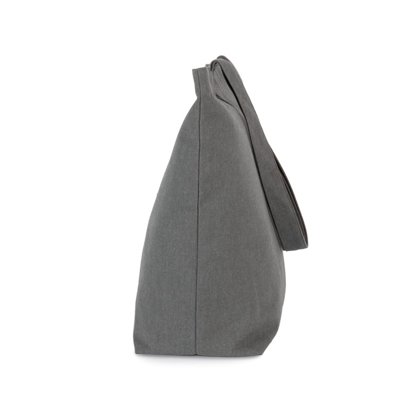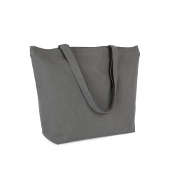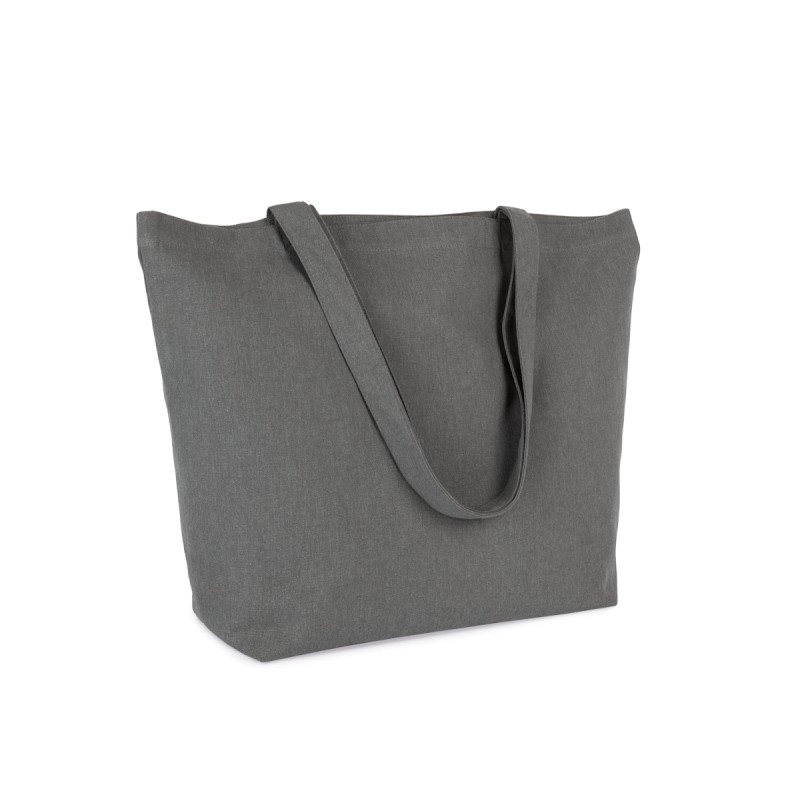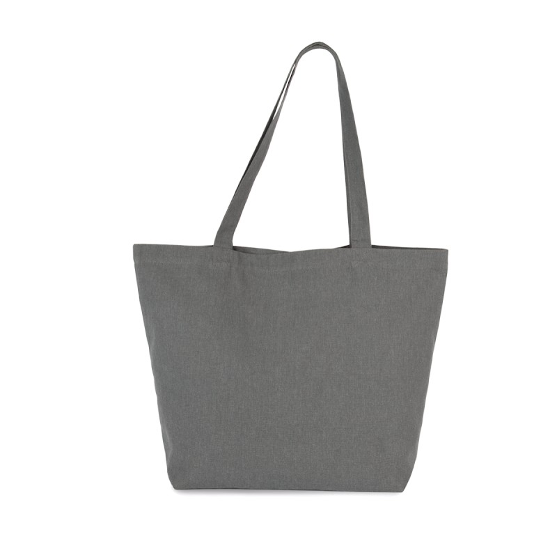 Coton recyclé / polyester recyclé. Grand sac shopping à fond plat et anses du même tissu que le sac. Ce sac fait partie du projet "K-loop". À travers ce projet, Kimood ferme la boucle de l’économie circulaire au sens strict. Le coton utilisé provient en effet des déchets de fabrication des articles en coton de la marque Kariban, de la gamme KARIBAN BRANDS. Le polyester ajouté est issu du recyclage de bouteilles plastique en PET. Durant le processus de recyclage, des traceurs sont ajoutés au fil, à savoir des filaments en viscose et céramique qui font office d’empreinte digitale unique. Les traceurs réfléchissent la lumière de façon unique, et portent donc un code univoque et inviolable. Grâce à cela, nous pouvons donc mémoriser dans une chaîne de blockchain, toutes les informations des processus auxquels le fil a été soumis de façon univoque. Grâce à la technologie des traceurs Aware™ et à la plate-forme correspondante de blockchain, Kimood permet au consommateur final de suivre l’ensemble du processus de production. Cela permet de garantir que le produit a bien été recyclé en utilisant ses propres déchets, sans altérations possibles du processus. Une étiquette spéciale avec un QR code permet d’accéder à la plate-forme Aware™ et d’authentifier directement les certifications via un simple smartphone.