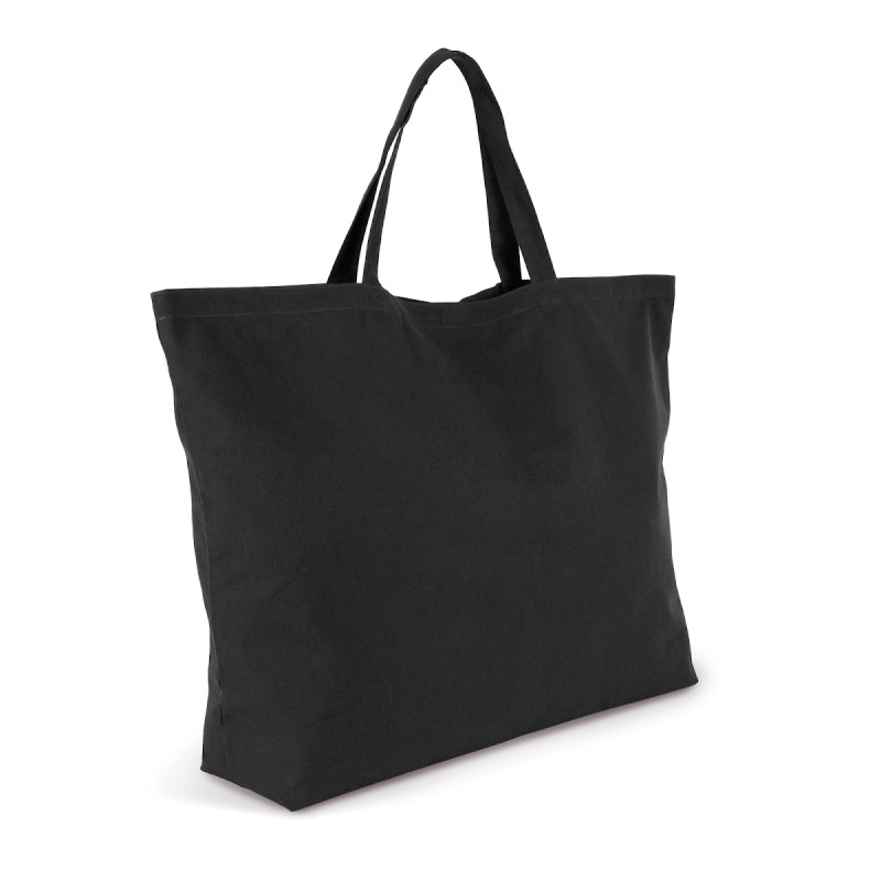 Coton recyclé / polyester recyclé. Très grand sac shopping avec poignées du même tissu que le sac. Ce sac fait partie du projet "K-loop". À travers ce projet, Kimood ferme la boucle de l’économie circulaire au sens strict. Le coton utilisé provient en effet des déchets de fabrication des articles en coton de la marque Kariban, et de la gamme KARIBAN BRANDS. Le polyester ajouté est issu du recyclage de bouteilles plastique en PET. Durant le processus de recyclage, des traceurs sont ajoutés au fil, à savoir des filaments en viscose et céramique qui font office d’empreinte digitale unique. Les traceurs réfléchissent la lumière de façon unique, et portent donc un code univoque et inviolable. Grâce à cela, nous pouvons donc mémoriser dans une chaîne de blockchain, toutes les informations des processus auxquels le fil a été soumis de façon univoque. Grâce à la technologie des traceurs Aware™ et à la plate-forme correspondante de blockchain, Kimood permet au consommateur final de suivre l’ensemble du processus de production. Cela permet de garantir que le produit a bien été recyclé en utilisant ses propres déchets, sans altérations possibles du processus. Une étiquette spéciale avec un QR code permet d’accéder à la plate-forme Aware™ et d’authentifier directement les certifications via un simple smartphone.