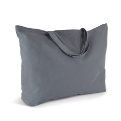 Coton recyclé / polyester recyclé. Très grand sac shopping avec poignées du même tissu que le sac. Ce sac fait partie du projet "K-loop". À travers ce projet, Kimood ferme la boucle de l’économie circulaire au sens strict. Le coton utilisé provient en effet des déchets de fabrication des articles en coton de la marque Kariban, et de la gamme KARIBAN BRANDS. Le polyester ajouté est issu du recyclage de bouteilles plastique en PET. Durant le processus de recyclage, des traceurs sont ajoutés au fil, à savoir des filaments en viscose et céramique qui font office d’empreinte digitale unique. Les traceurs réfléchissent la lumière de façon unique, et portent donc un code univoque et inviolable. Grâce à cela, nous pouvons donc mémoriser dans une chaîne de blockchain, toutes les informations des processus auxquels le fil a été soumis de façon univoque. Grâce à la technologie des traceurs Aware™ et à la plate-forme correspondante de blockchain, Kimood permet au consommateur final de suivre l’ensemble du processus de production. Cela permet de garantir que le produit a bien été recyclé en utilisant ses propres déchets, sans altérations possibles du processus. Une étiquette spéciale avec un QR code permet d’accéder à la plate-forme Aware™ et d’authentifier directement les certifications via un simple smartphone.