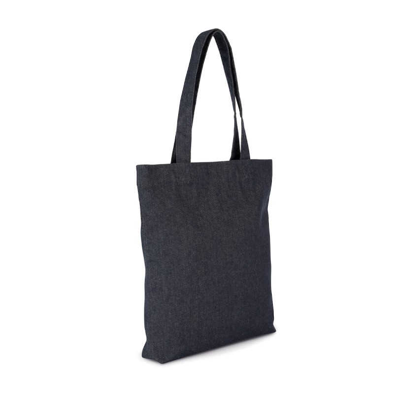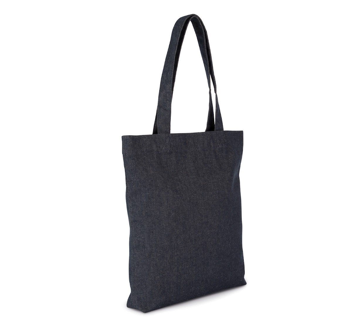 70% coton recyclé / 28% polyester recyclé / 2% autres fibres. Sac de shopping à fond plat avec anses réalisées dans la même matière que le sac. Étant recyclée, cette matière ne perd pas sa couleur.