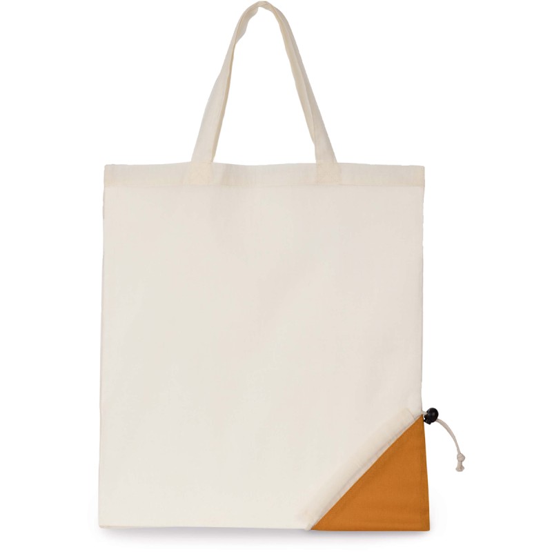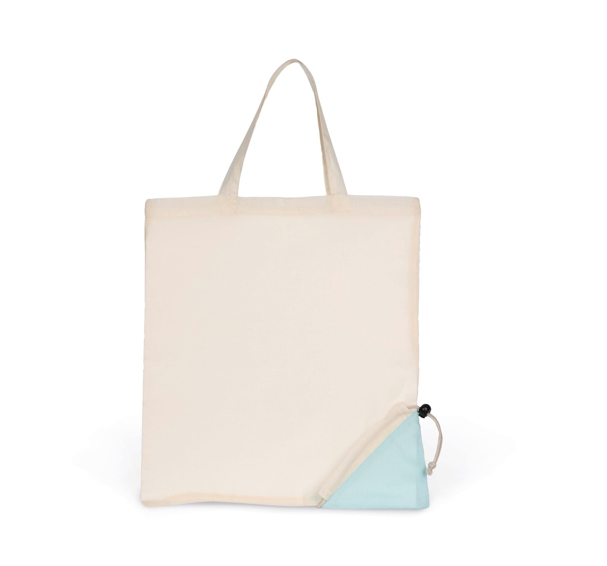 100% coton biologique. Le sac se replie sur lui-même dans sa propre pochette fermée par un cordon.