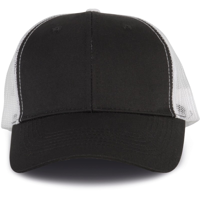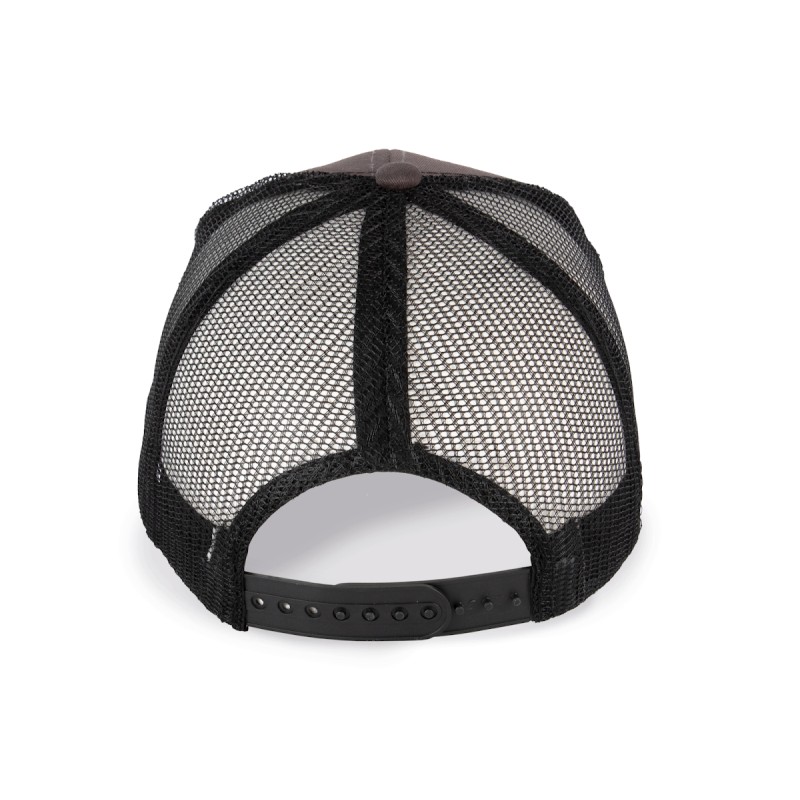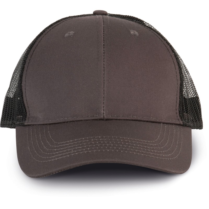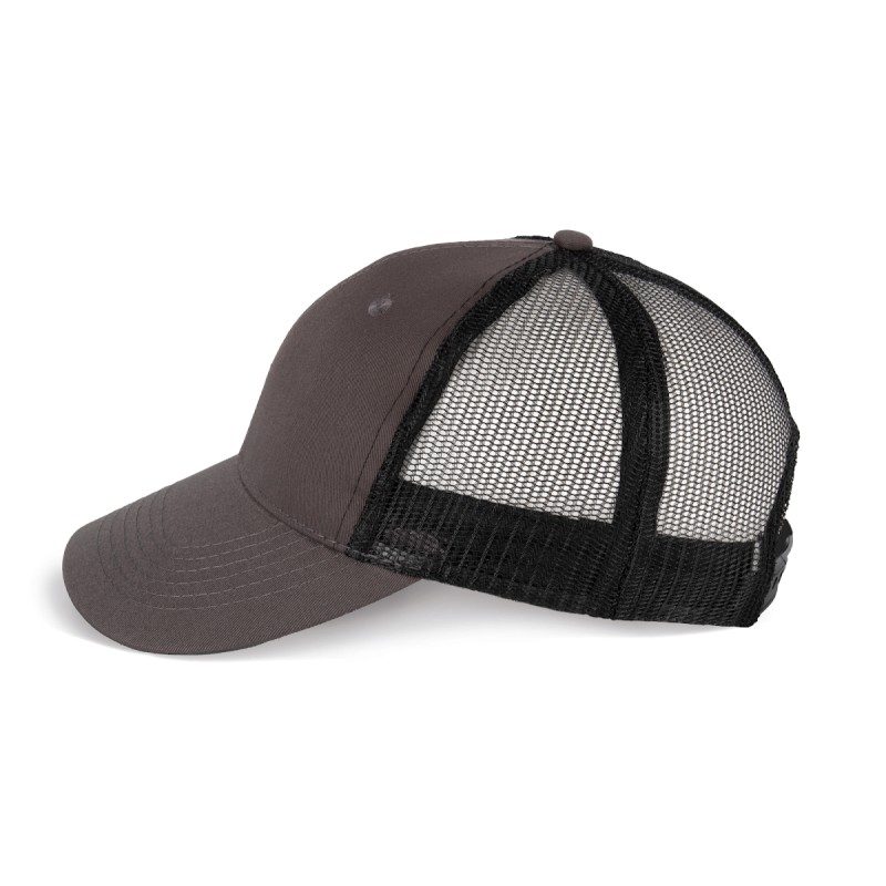 65% coton / 35% polyester. Casquette trucker 6 panneaux avec visière mi-profil et panneaux avant renforcé ton sur ton.