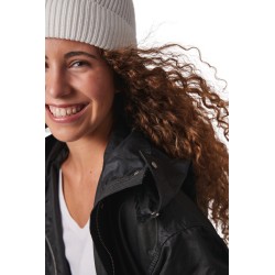 100% Polylana® (50% polyester recyclé / 50% polyester). Bonnet avec revers. La fibre de Polylana® est une matière aussi douce et agréable au toucher que la laine, alternative à l'acrylique et caractérisée par un faible impact environnemental, dont la production nécessite moins d’énergie, d’eau et d’émissions de CO2. Le fil de Polylana® est certifié Impact Aware™, en garantissant, sur l’ensemble de la filière de production, un produit 100% transparent et intègre, avec possibilité, via la plate-forme de blockchain Aware™, de vérifier l'authenticité de la fibre de Polylana®. Une étiquette spéciale avec un QR code permet d’accéder à la plate-forme Aware™ et d’authentifier directement les certifications via un simple smartphone.