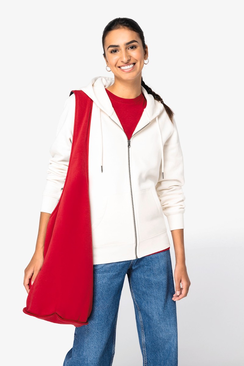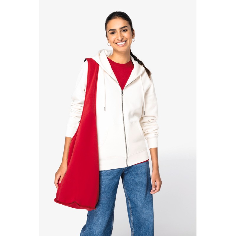 Extérieur : 85% coton biologique. 15% polyester recyclé post-consumer. Doublure : 75% coton recyclé pre-consumer / 22% polyester recyclé post-consumer / 3% autres fibres. ONE SIZE (36 x 55 x 85cm). Capacité : 25L. Coton peigné. Molleton gratté 3 fils LSF (Low Shrinkage Fleece : molleton pré-réteci). Lavé aux enzymes. Doublé avec poche intérieure zippée et zip pour la personnalisation en nylon recyclé. Fermeture par boutons aimantés.