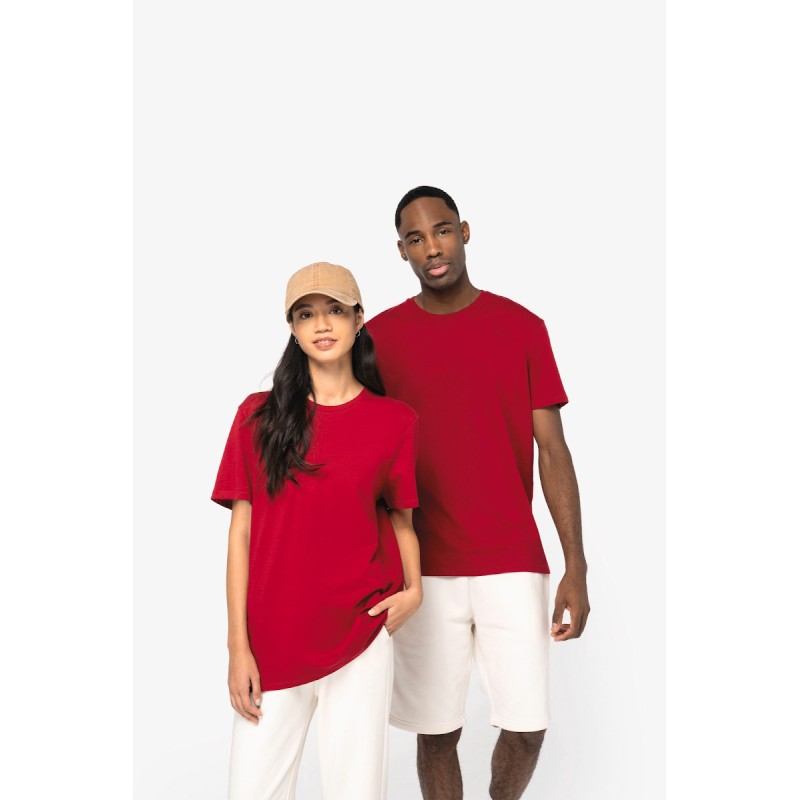 100% coton biologique. Coton peigné ringspun. Coupe ajustée. Coutures latérales. Lavé aux enzymes. Bord côte col 1x1. Bande de propreté intérieure col en matière principale. Ourlet double surpiqûre bas de manches et bas de vêtement. La couleur Raw Natural se distingue par son aspect brut visuellement texturé, parsemée de fines particules visibles à l’œil nu.