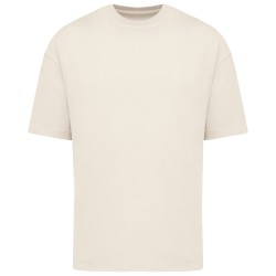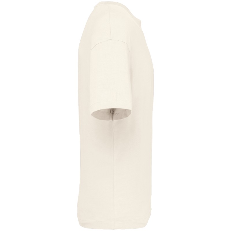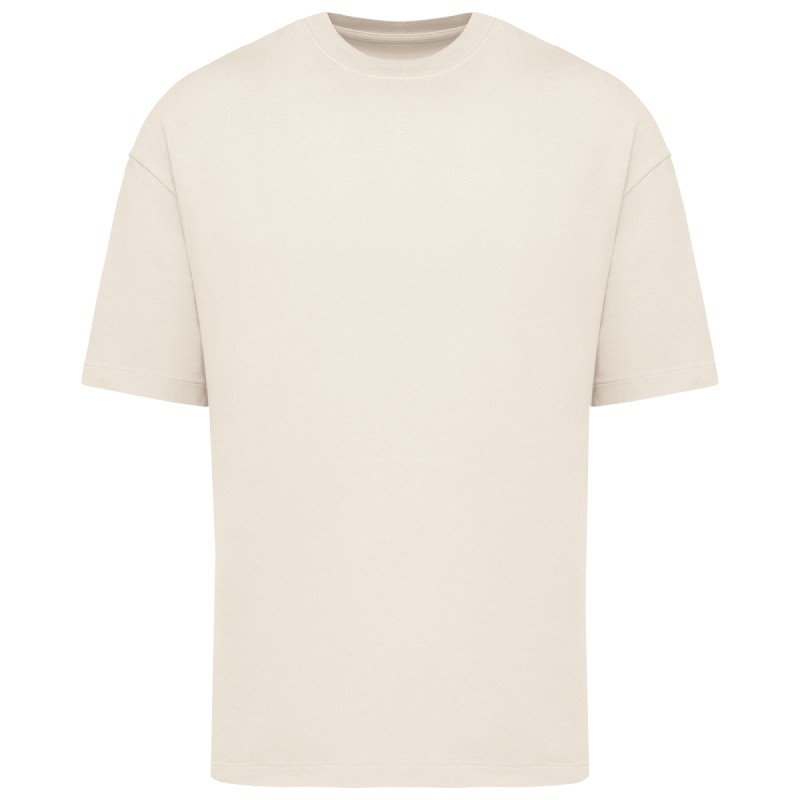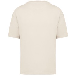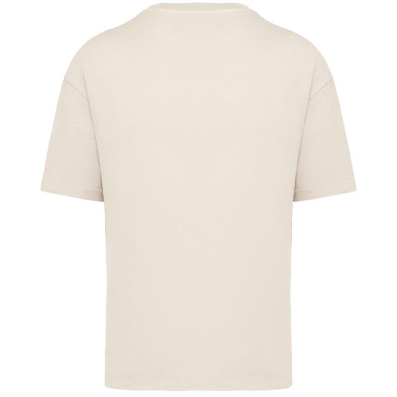 100% coton biologique. Coton cardé. Coupe oversize à épaules tombantes. Coutures latérales. Toucher légèrement « rêche ». Bord côte col 1 x 1. Bande de propreté intérieure col en matière principale. Ourlet simple surpiqûre bas de manches et bas de vêtement.