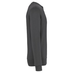 85% coton biologique / 15% polyester recyclé post-consumer. Coton peigné ringspun. Coupe ajustée. Lavé aux enzymes. Molleton gratté 3 fils LSF (Low Shrinkage Fleece : molleton pré-rétréci). 1/2 lune dans le dos. Bord cote 1 x 1 encolure, bas de vêtement et bas de manches. Double surpiqûre bas de manches, emmanchures, bas de vêtement. Simple surpiqûre à l’encolure. Bande de propreté intérieur encolure dos. La couleur Raw Natural se distingue par son aspect brut visuellement texturé, parsemée de fines particules visibles à l’œil nu.