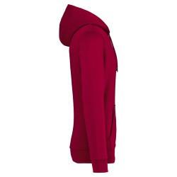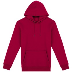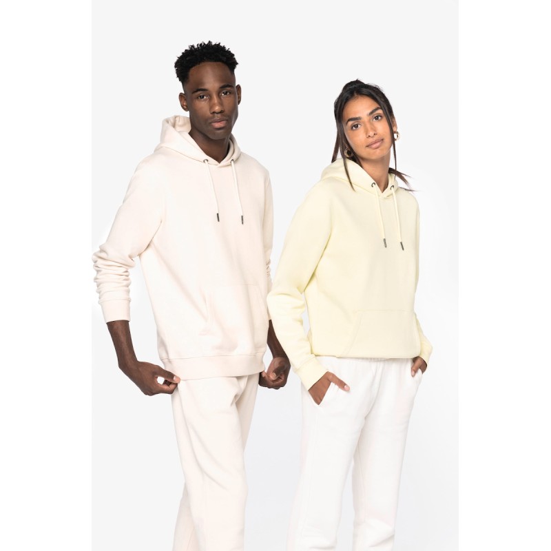 85% coton biologique / 15% polyester recyclé post-consumer. Coton peigné ringspun. Coupe ajustée. Lavé aux enzymes. Molleton gratté 3 fils LSF (Low Shrinkage Fleece : molleton pré-rétréci). 1/2 lune au dos. Poche kangourou. Bord cote 1 x 1 bas de vêtement et bas de manches. Double surpiqûre bas de manches, emmanchures, bas de vêtement et 1/2 lune. Bande de propreté intérieur encolure dos. Capuche doublée en matière principale avec point d’arrêt cordon. Cordon rond avec embouts et oeillets en métal recyclé. La couleur Raw Natural se distingue par son aspect brut visuellement texturé, parsemée de fines particules visibles à l’œil nu.