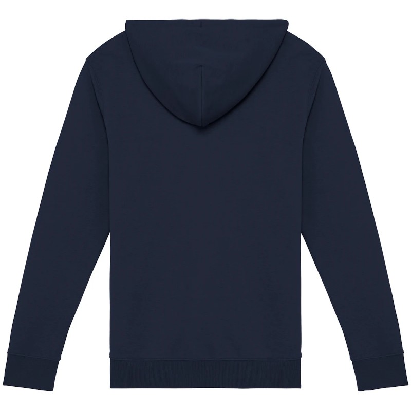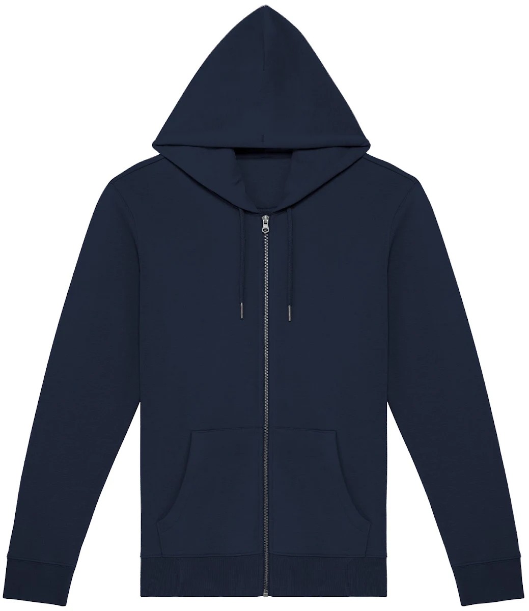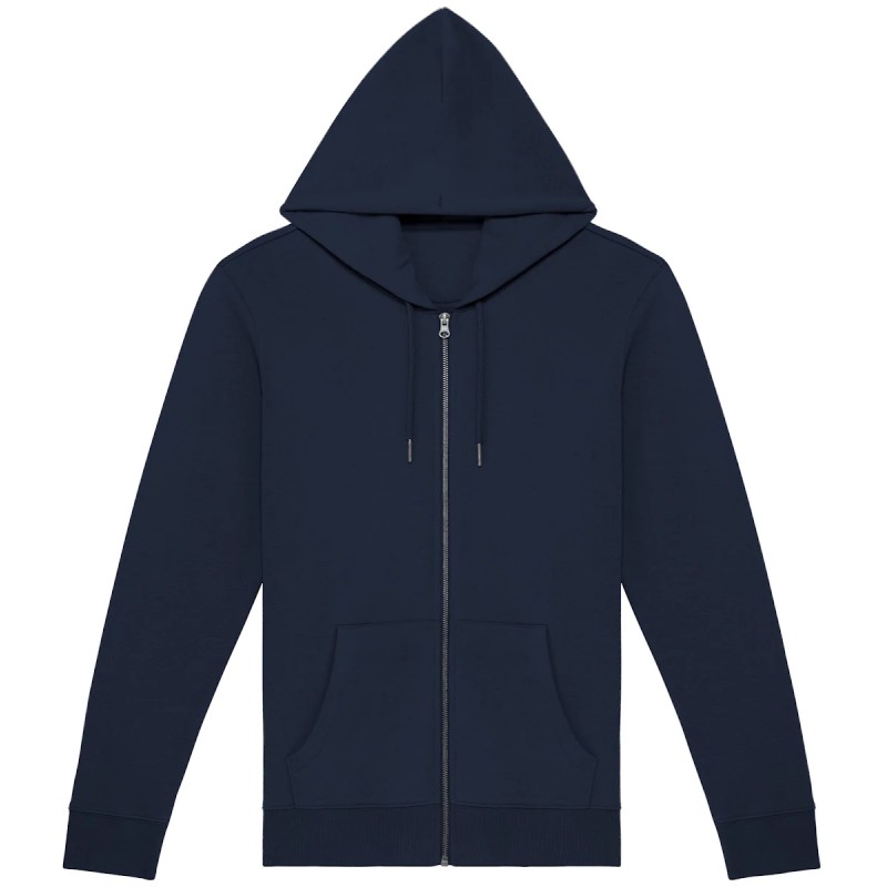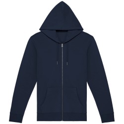 85% coton biologique / 15% polyester recyclé post-consumer. Coton peigné ringspun. Coupe ajustée. Lavé aux enzymes. Molleton gratté 3 fils LSF (Low Shrinkage Fleece : molleton pré-rétréci). Zip métal. 1/2 lune au dos. 2 poches kangourou. Bord cote 1 x 1 bas de vêtement et bas de manches. Double surpiqûre bas de manches, emmanchures, bas de vêtement. Capuche doublée en matière principale avec point d’arrêt cordon. Cordon rond avec embouts et oeillets en métal recyclé. Bande de propreté intérieure en chevrons.