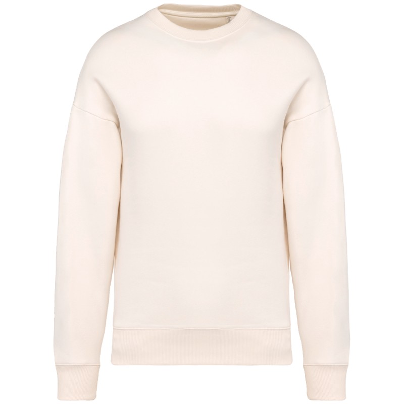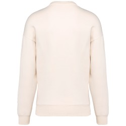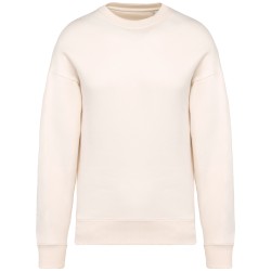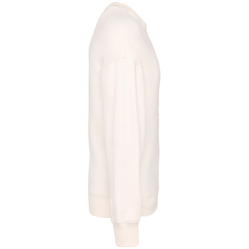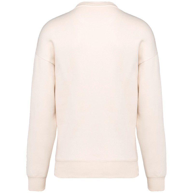 85% coton biologique / 15% polyester recyclé post-consumer. Coton peigné ringspun. Lavé aux enzymes. Coupe oversize à épaules tombantes. Molleton gratté 3 fils LSF (Low Shrinkage Fleece : molleton pré-rétréci). 1/2 lune au dos. Bord côte 2 x 1 au col, bas de vêtement et bas de manches. Double surpiqûre à cheval sur le col, les bas de manches et le bas de vêtement. Bande de propreté intérieure en chevrons ton sur ton à l’encolure. La couleur Raw Natural se distingue par son aspect brut visuellement texturé, parsemée de fines particules visibles à l’œil nu.