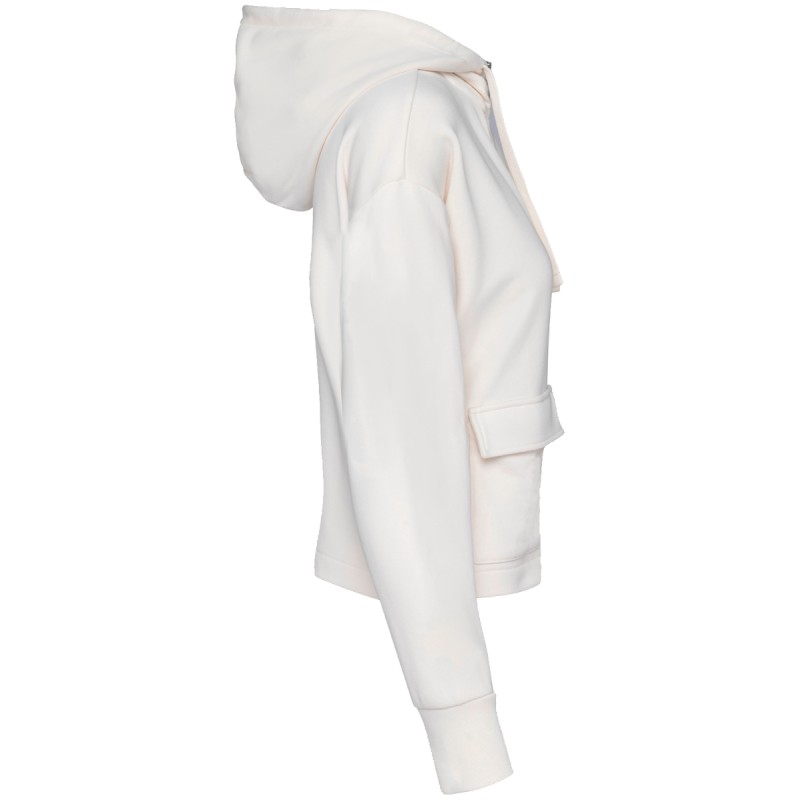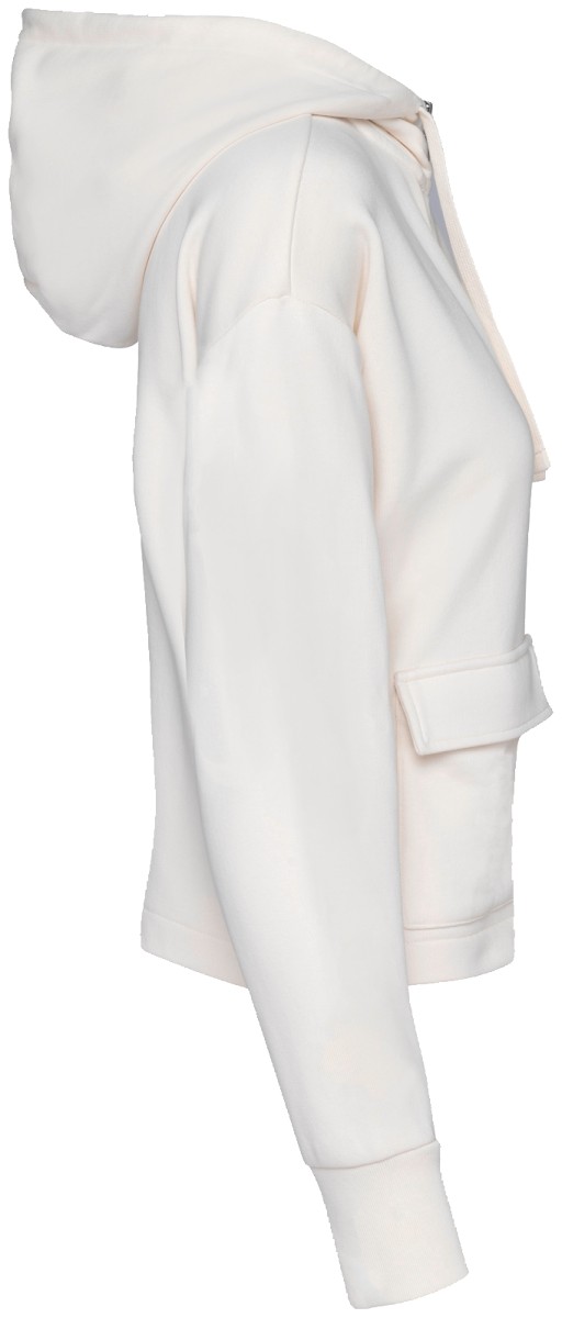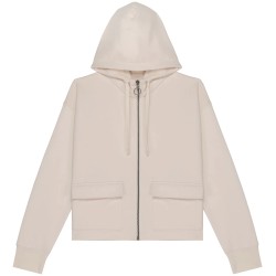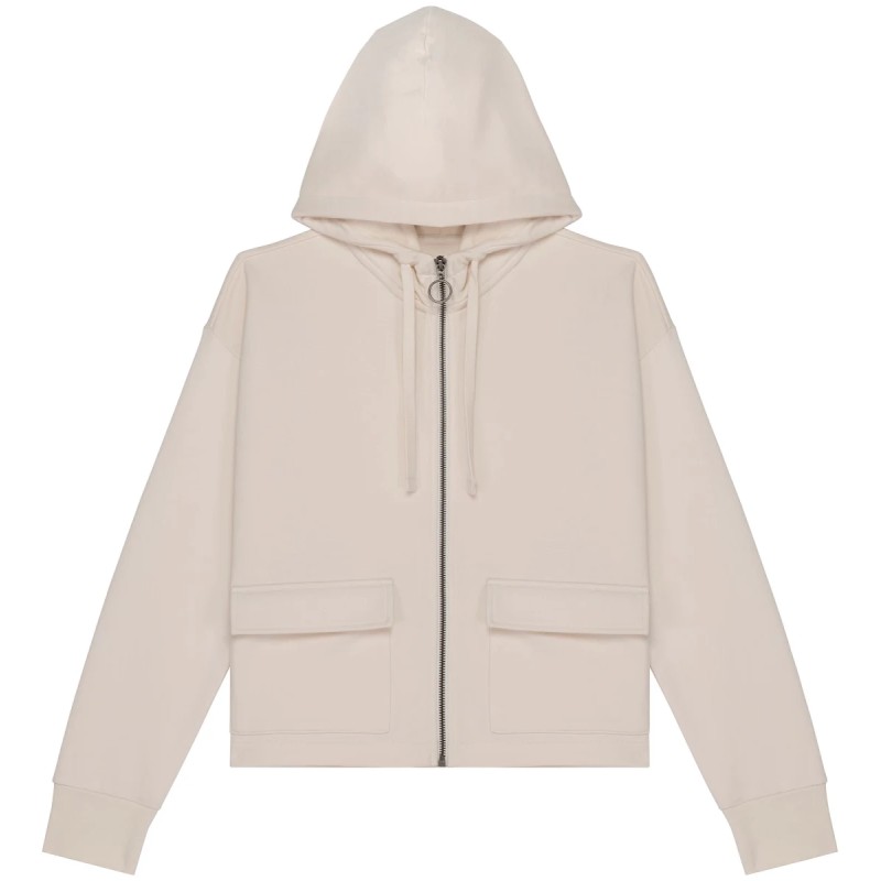 85% coton biologique / 15% polyester recyclé post-consumer. Coton peigné. Coupe confort avec épaules tombantes. Molleton non gratté (French Terry). 3 fils LST (Low Shrinkage Terry : pré-rétréci). 1/2 lune dans le dos. Lavé aux enzymes. Zip en métal recyclé avec tirette en forme arrondie. Deux poches plaquées devant avec rabat. Capuche à pince doublée en matière principale. Cordon de serrage plat en coton biologique. Bande de propreté intérieure encolure en chevrons. Finition bas de manches en bord côte 1 x 1. Finition bas de vêtement en simple surpiqûre. Finition intérieure du zip avec biais de propreté en jersey.