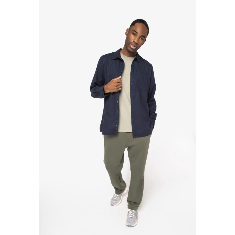 100% coton biologique. Coton twill. Coupe droite. Tissu brossé sur l’extérieur. Boutons en plastique recyclé ton sur ton. Col avec pied de col. Poche poitrine plaquée côté coeur. Bas de manches avec poignet et capucin avec boutons. Pli rond au dos. Patte de boutonnage rapportée.