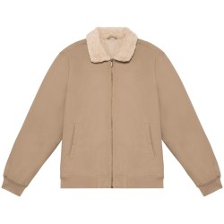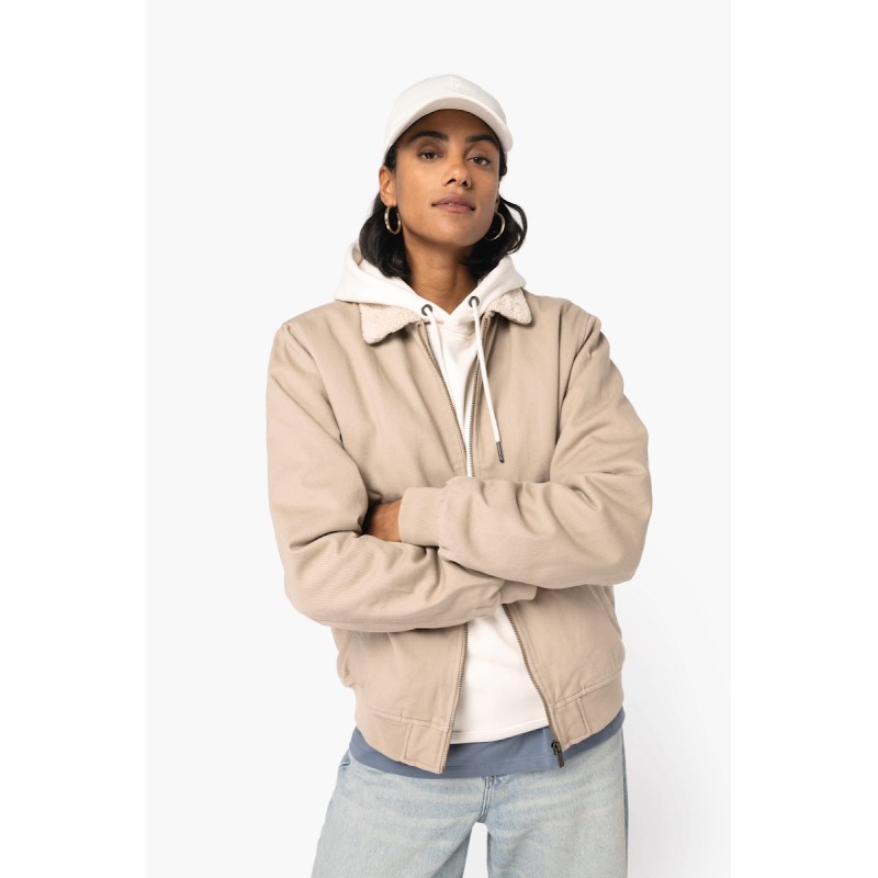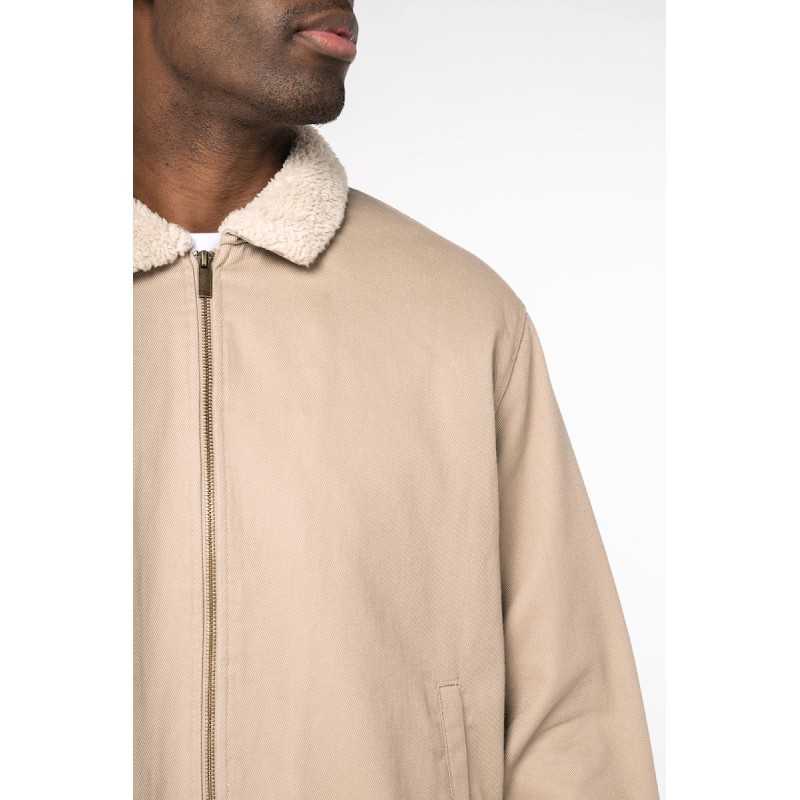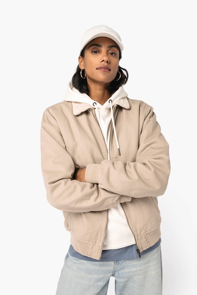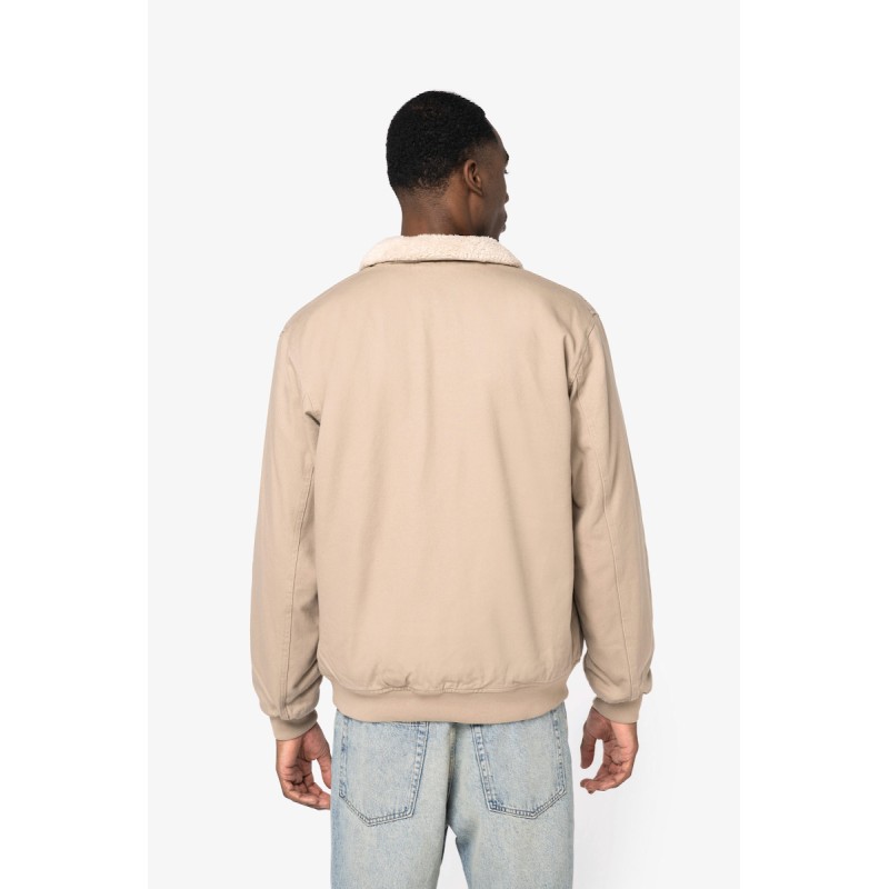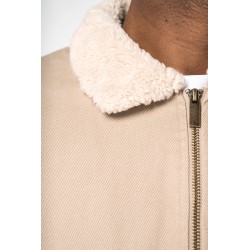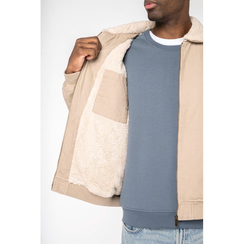 100% coton biologique. Coton twill. Patch de personnalisation intérieur col. Produit lavé. 2 poches devant. Zip en métal recyclé. Extérieur du col et doublure du corps en Sherpa en polyester recyclé post-consumer. Bord côte 1 x 1 bas de vêtement et bas de manches.