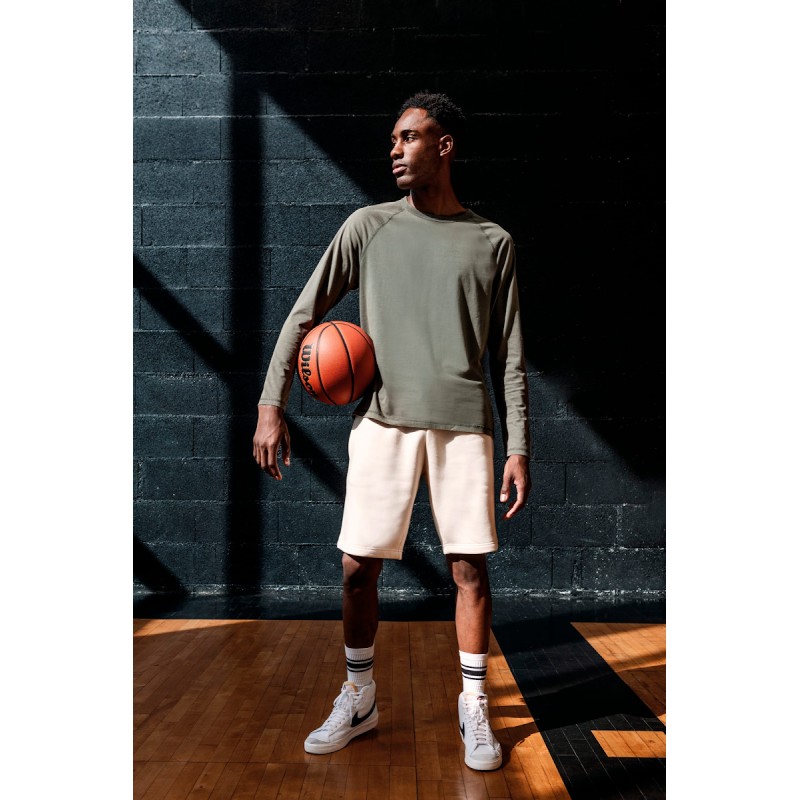 85% coton biologique / 15% polyester recyclé post-consumer. Coton peigné ringspun. Lavé aux enzymes. Molleton gratté 3 fils LSF (Low Shrinkage Fleece). Ceinture bord cote 1 x 1 avec cordon de serrage. OEillet boutonnière pour cordon ceinture. Poches côtés. 1 poche arrière passepoilée. Ourlet bas de jambes double surpiqûre. La couleur Raw Natural se distingue par son aspect brut visuellement texturé, parsemée de fines particules visibles à l’œil nu.